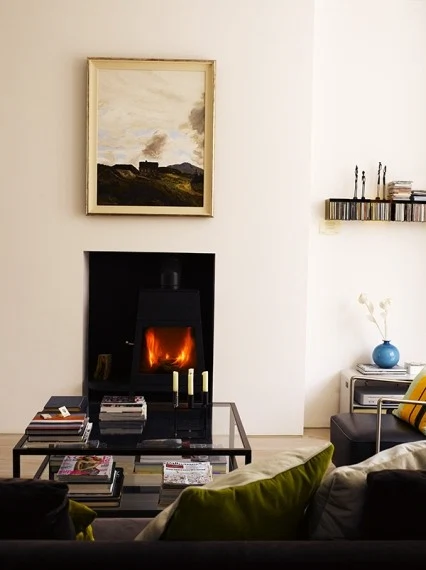 The Charles sofa is by B&B Italia. The wood-burning stove is by Antonia Citterio. The PK 1 leather chairs are from Coexistence.
