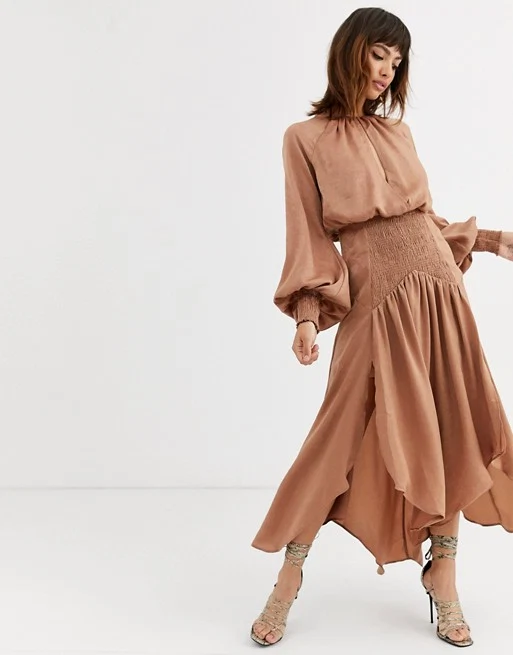 ASOS Design satin blouson midi dress with shirring and keyhole detail, €76.04 at Asos