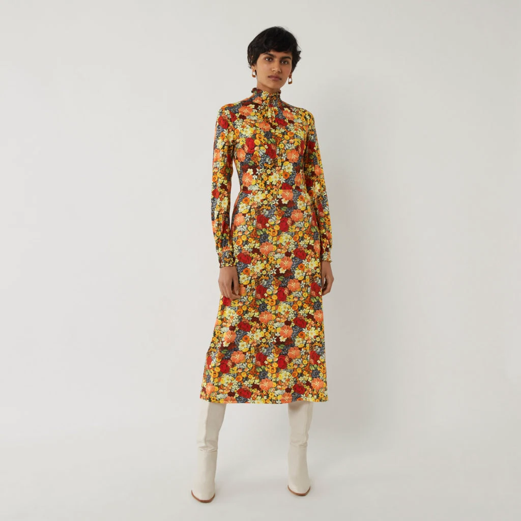 Our favourite is the Mia floral funnel neck dress from Warehouse. It has the right amount of seventies nostalgia without being overkill, and it will look great over knee-high boots or platform heels.