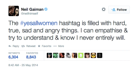 Young men like the Isla Vista killer grow up in a world where women are meant to dismiss groping in crowded bars as what happens on Saturday nights, accept wolf whistles as compliments and almost apologise when refusing a man access to their body. A Washington Post article pointed to the ?bro? movies? of Seth Rogen and Judd Apatow as ‘misleading young men with ?escapist fantasies? of ‘sexual wish fulfillment?. While such near-accusations lay perhaps too much blame at the feet of Hollywood, there is a rampant ?bro? culture that young men are being force-fed, where bawdiness and bragging are rampant and selfies proof you’re living the high life. It’s a culture of entitlement, and women are just commodities. Sit these guys in front of a screen, sans a first person shooter game, and make them scroll the hashtag. In the first flush of tweets, Neil Gaiman wrote ?The #yesallwomen hashtag is filled with hard, true, sad and angry things. I can empathise & try to understand & know I never entirely will.?