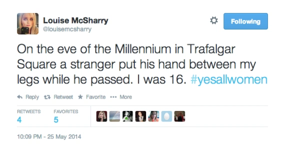 ?When I was 19 a middle-aged man sat on my lap on a busy Dart, fondled my breasts and licked my face. No one did anything. #yesallwomen? Louise McSharry