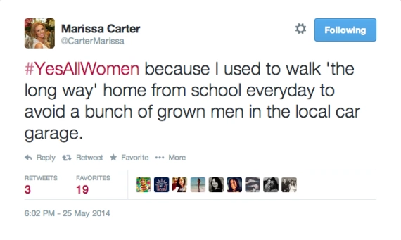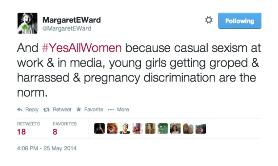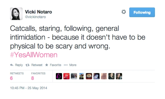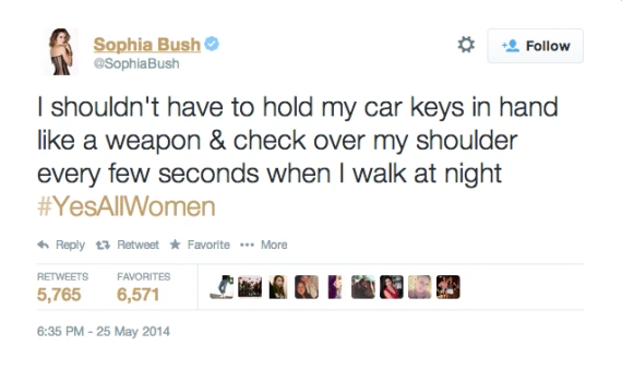 As the news of the murders broke, people on Twitter were horrified, and some strangely defensive. Emma Woolley with Toronto’s The Globe and Mail calls this the ?not all men? era.?As soon as a high-profile misogynistic incident occurs, men, and sometimes women, jump in to comment that not all men are like this. Not all men are like Dominique Strauss-Kahn. Not all men make death threats against women campaigning to put Jane Austen on the €10 note. Not all men want ‘retribution? against ?every single spoiled, stuck-up, blond slut? that told them no, to quote the Isla Vista killer. Then something extraordinary happened. Women got fed up with the hijacking of the conversation around violence against women and thus the hashtag #YesAllWomen was born. #YesAllWomen focuses on what women fear, every day, and not what men might or might not do. Tweets began tumbling in at an unprecedented pace, over one million were registered yesterday.