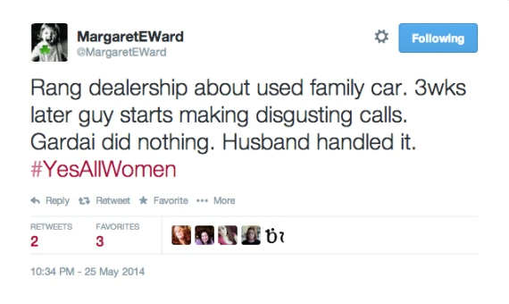 This past week stories similar to 2FM presenter McSharry’s have been blitzing social media with the hashtag #YesAllWomen. The whole ?campaign? began last weekend, in the aftermath of a mass-shooting in Isla Vista, California. A young man killed six young people including his three flatmates, two girls standing outside a sorority and a man in a deli. Just before his multiple crimes he had published a manifesto, entitled ?My Twisted World?, and a Youtube video, ?Retribution?, in which he said his intended plan to kill women was motivated by their not sleeping with him. No religious ideology. No aims to redraw political borders. He allegedly turned the gun on himself during a police shootout.