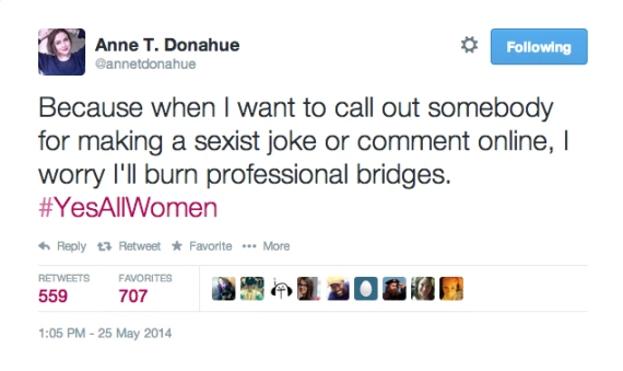 ?Because when I want to call out somebody for making a sexist joke or comment online, I worry I’ll burn professional bridges. #YesAllWomen? @annetdonahue