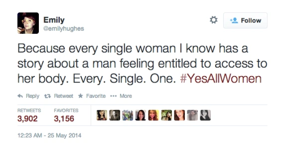 ?Because every single woman I know has a story about a man feeling entitled to access to her body. Every. Single. One. #YesAllWomen? @emilyhughes