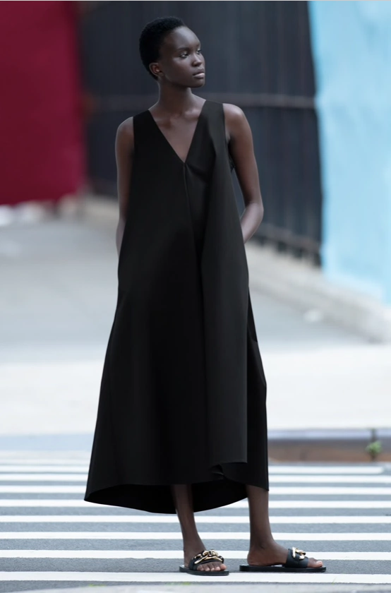 Our top pick is the black flounce dress, complete with a flattering v-neck and pockets. Pair with the oversized leather clutch and orange tie strap sandals for ultimate relaxed chic.