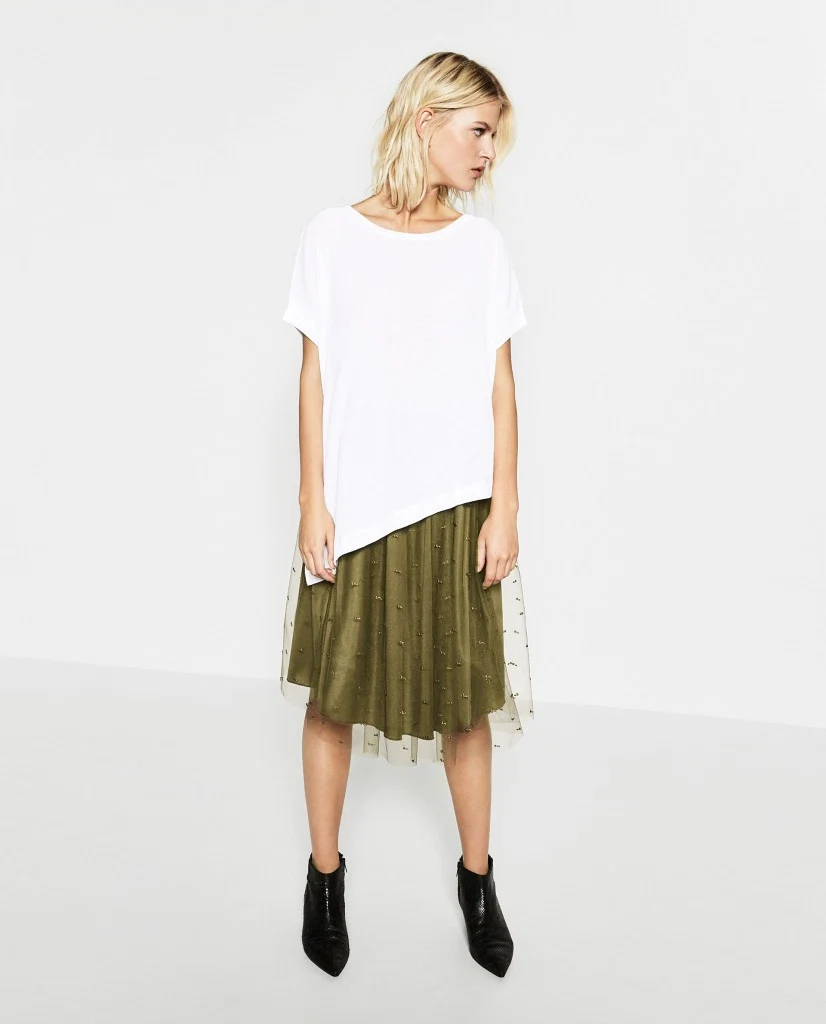 Try?a tulle skirt which has layers of sheer fabric overlayed. The outer layer, which dips lower than the rest, reveals the see-through make-up of the skirt without showing too much leg. I love the embellishment on this Zara skirt as well as the avocado shade.