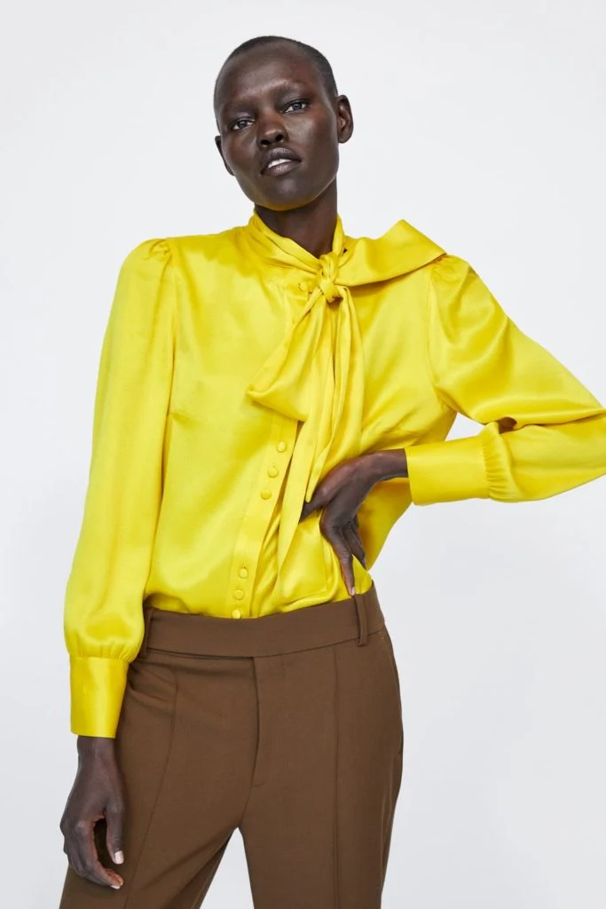 Satin blouse with tied bow detail, €39.95 at Zara