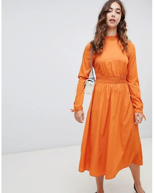 Another summery shade on Pantone’s palette is ‘Turmeric’, although this semi-neon orange is much more fiery than Living Coral. Described as “an enlivening orange that infuses a hint of pungency onto the palette”, this colour really packs a punch and is best confined to one key piece in an outfit for the faint of heart. However, if your one piece is a flowing midi dress, you can have the best of both worlds with this warming outfit.