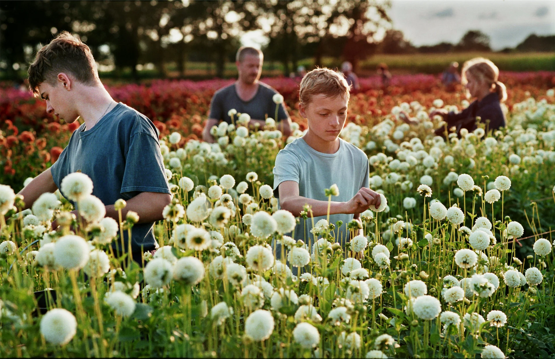 Yeah, I mean, this is a film about the Garden of Eden and about the beauty of connection and childhood, but it’s also a film about what happens when brutality seeps in and, and I think it’s also a film about shadows, not only about the light. But I do always hope to find or look for beauty, and maybe in doing so in this film, maybe an audience member is inspired to do so as well. I think I am very drawn and interested in films like those of Wong Kar-wai or Xavier Dolan who use colour in such an expressive way, and I kind of always feel like even if there’s a very documentary approach with the actors, and this sort of visual approach, there’s something that really reminds us that this is fiction too. I also write in this way – with colour and light and flowers and cutting flowers and moving from this field of fragile beauty to earth and machines and sounds that are brutal – that’s really my way of creating. It’s just the way that I think, and it’s the way I write.