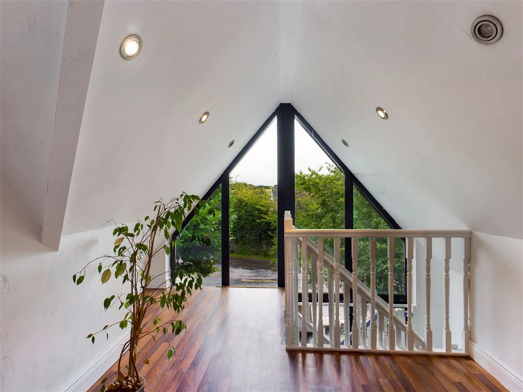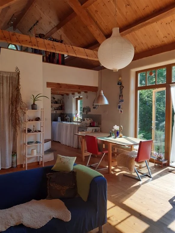 Flooded with natural light, the cottage itself is beautifully but simply designed. An entrance porch leads to a large central living space with impressive vaulted ceilings made from West Cork Larch. On one side of the living space is a ground-floor bedroom, while the kitchen area is to the other side. There are overhead rooms on either side of the living room, each accessed via a Dutch staircase. One is used as a bedroom and the other as a study – though this could be converted into a third bedroom if required. The bathroom can be found off the entrance porch.