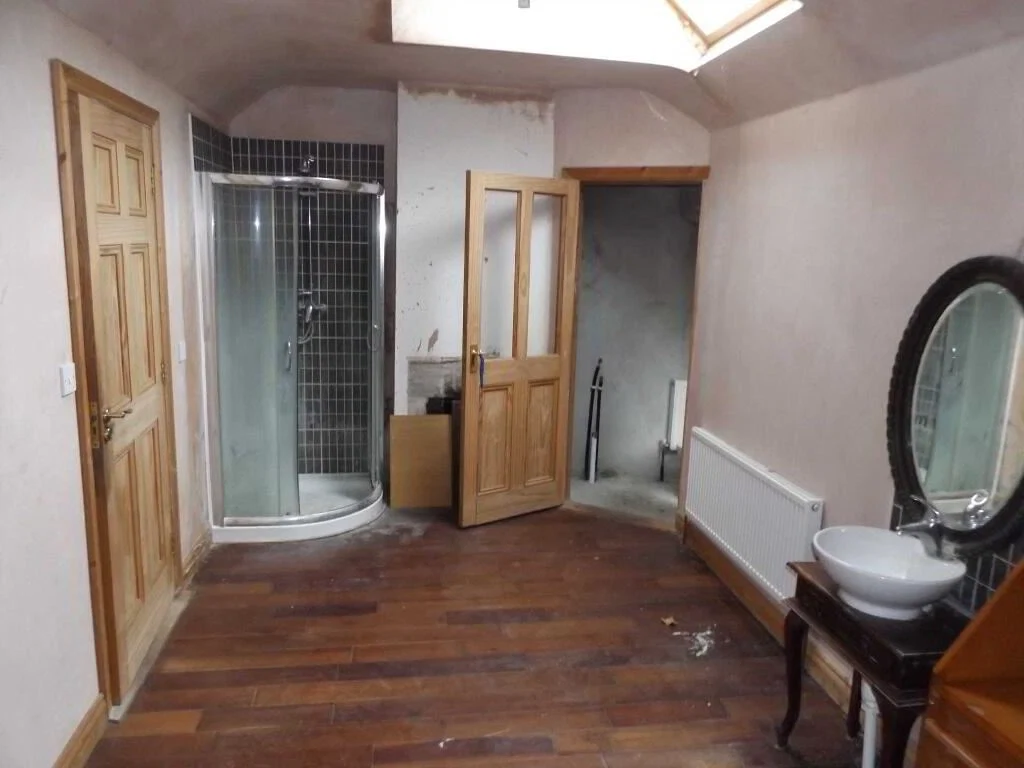 This former gate lodge has beautiful period features, and is actually larger than it appears from the front. Although it needs renovation, it has clearly been updated and lived in relatively recently, with skylights, modern radiators and wood floors visible in several rooms.