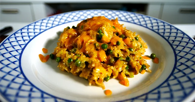 - Cook gently for 5 minutes, then add the smoked paprika, rice and petit pois, then season with some salt and pepper.