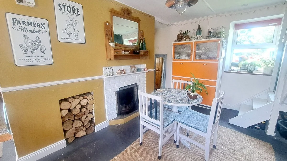 The house has some of its original features, and includes a kitchen and dining space, as well as a living room on the ground floor, while upstairs are the two bedrooms.
