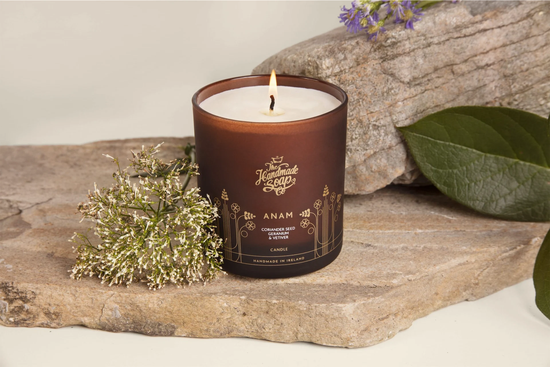 The Anam candle combines the light, fresh scent of coriander seed, a rich, earthy base of vetiver and notes of geranium, eucalyptus and lavender. Donagh says he was inspired by a very specific memory when creating it.