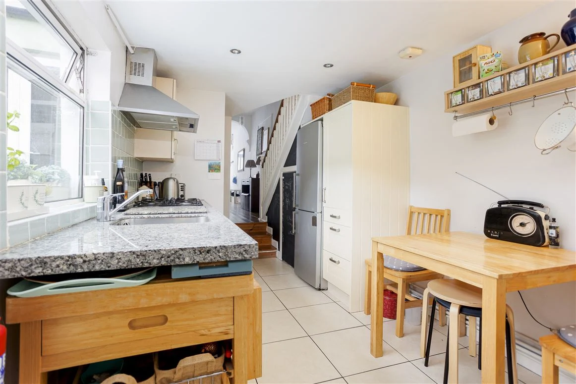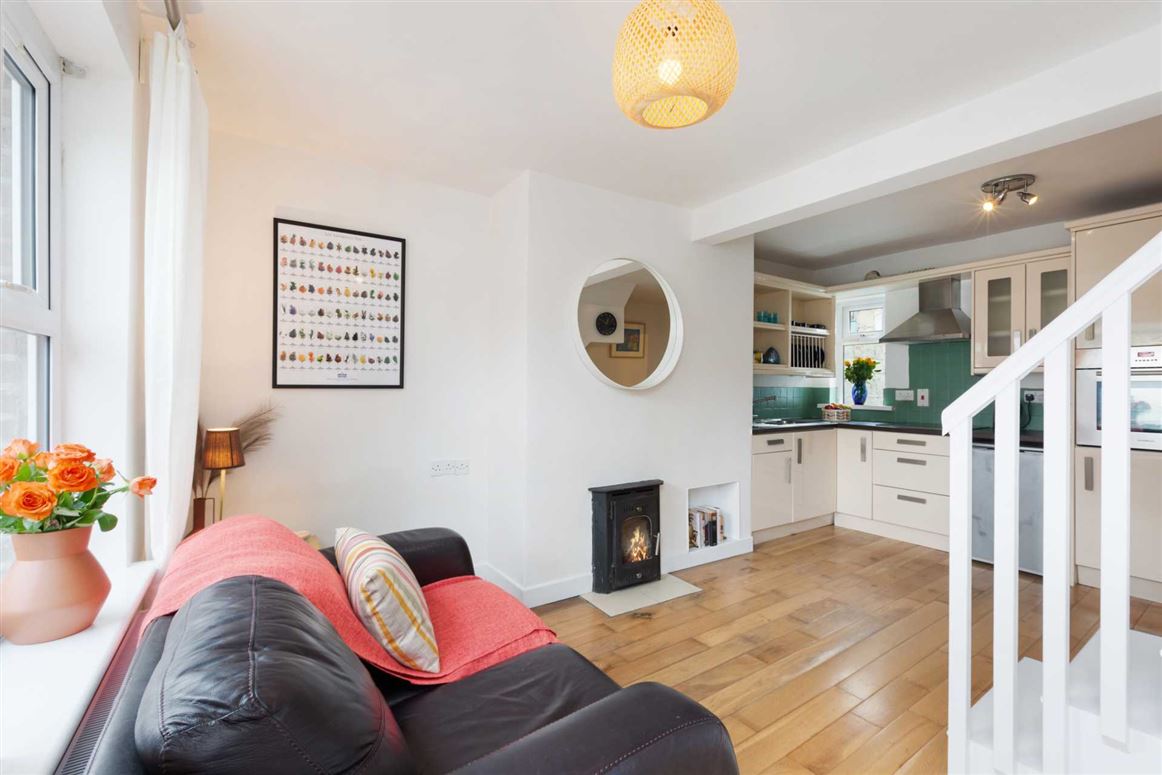 This two-bedroom mid-terrace cottage has a lovely main living and dining area, with a stove, a wooden floor, and fitted shelving. The kitchen and bathroom sit to the back of the house, and the kitchen opens up to the back garden.