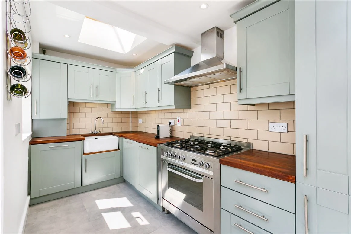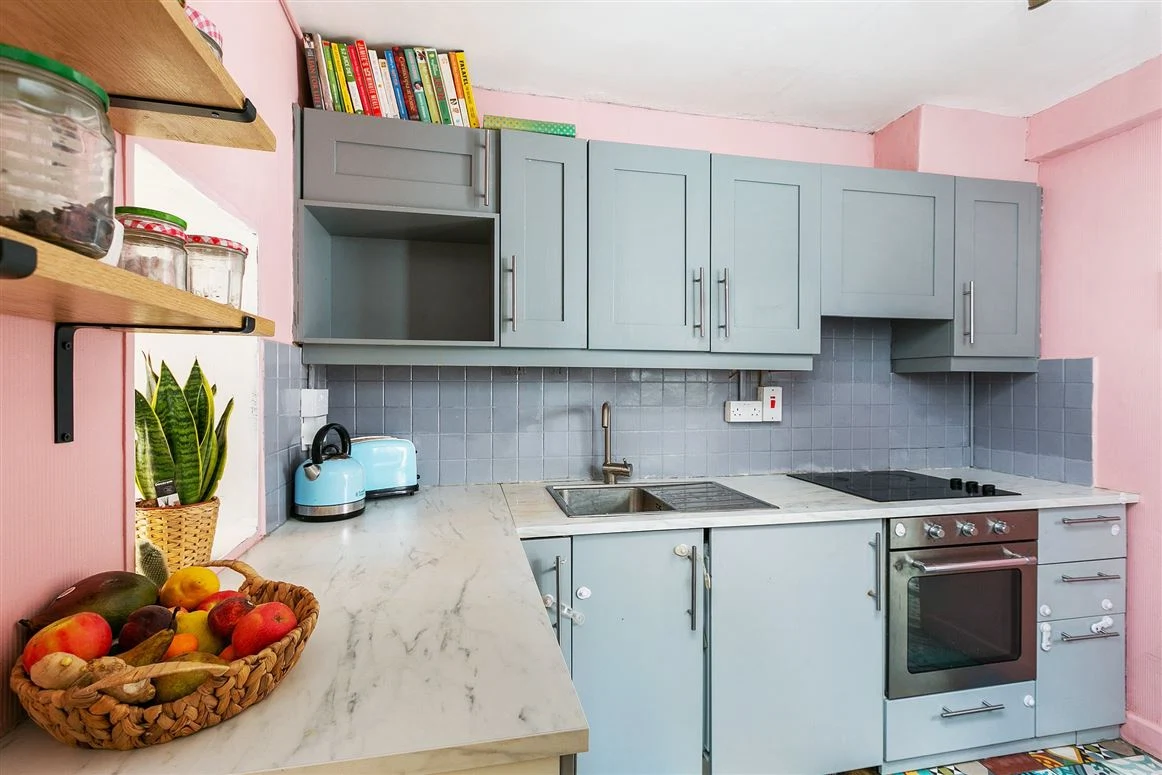 Pink and grey give some personality to what is a relatively basic kitchen while upstairs, the two bedrooms are kept very muted to allow for relaxing sleep zones.