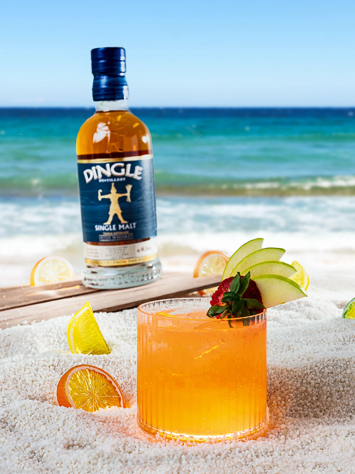 In a punch bowl, add Dingle Single Malt, apple juice, lemon juice and fresh chopped fruit, including strawberries, raspberries, peaches, apples, limes, lemons, oranges and whatever else you feel like. Chill in the fridge, then pour as needed.