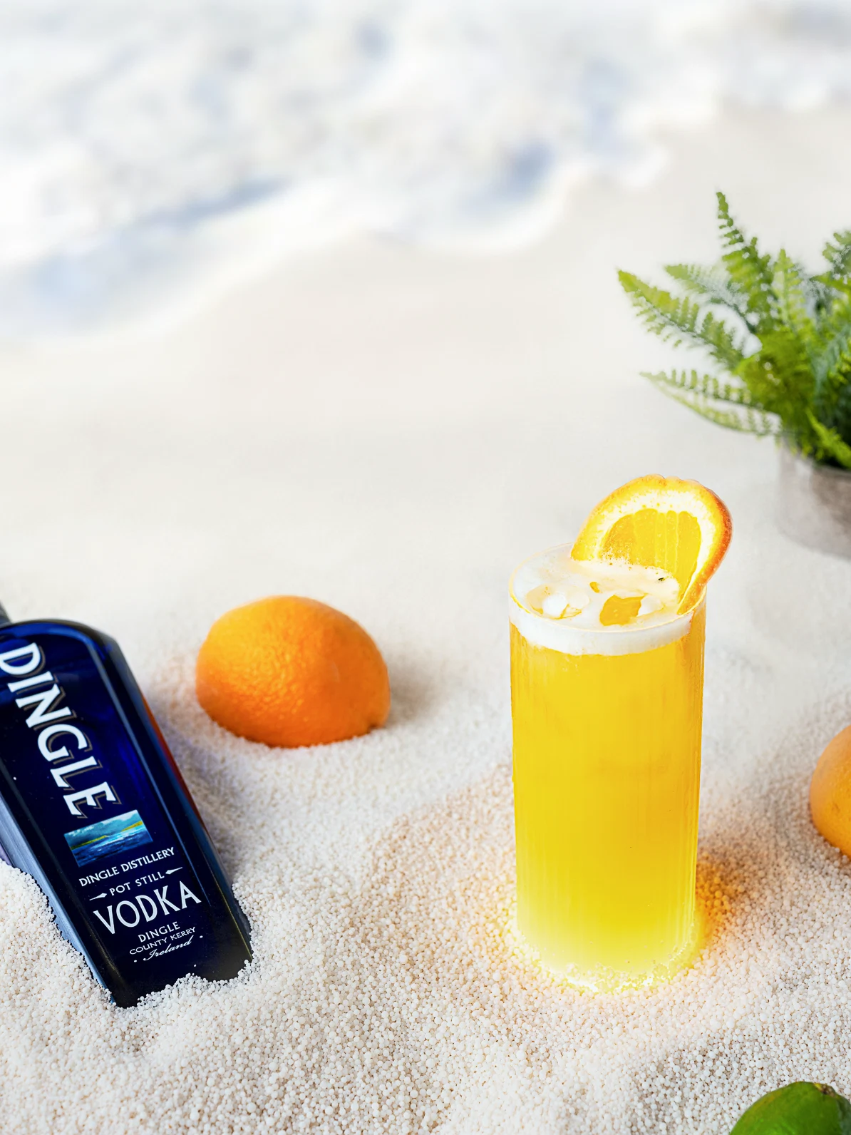 Add a shot of Dingle Vodka, fresh orange juice and some peach slices into a cocktail shaker. Shake and pour into a tall glass full of ice. Then garnish with a big orange wheel.