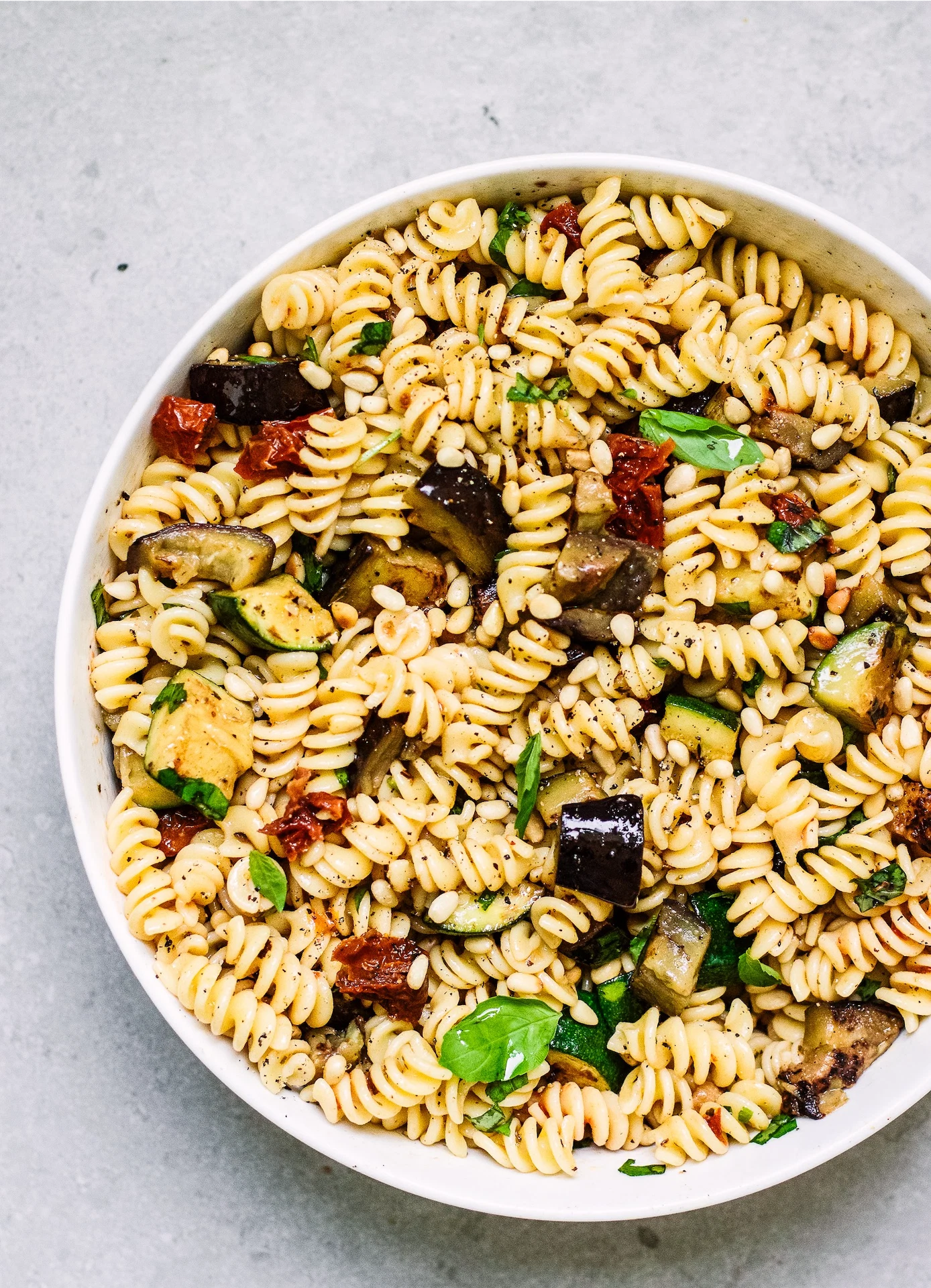 - Add the cold pasta to the bowl. Whisk together about 3 tablespoons of olive oil (it also works really well here to use the oil from the sundried tomatoes here), the juice of the lemon and the tomato paste until smooth.