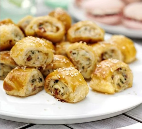 - Roll the pastry sheet on a lightly floured surface and cut in half lengthways. Spread half the chicken mixture along the middle of one of the pastry strips, then roll up the pastry, pinching the ends together to seal. Using a sharp knife, cut into 2.5cm long pieces. Repeat with the remaining pastry strip. Can be frozen, uncooked, for up to 1 month.