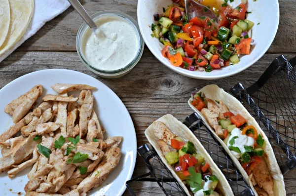 - Serve tacos in flour tortillas with chicken, a scoop of the chopped salad and topped with Greek yogurt. Squeeze a little lemon on tacos if desired.