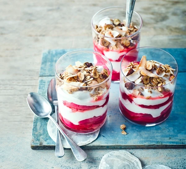 Take advantage of rhubarb season with these low-cal, protein-rich breakfast pots. Just combine non-fat greek yoghurt with roasted rhubarb, coconut chips, toasted oats and honeyed hazelnuts. (Olive Magazine)