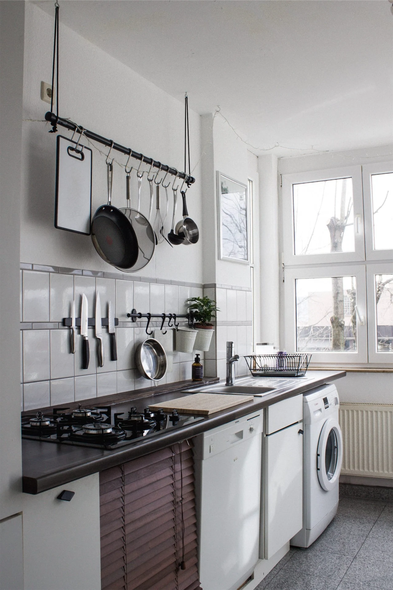 Use stick-on hooks to hang anything from frying pans to your most-used cooking utensils, and as an added bonus they’ll always be to hand. If you want to make use of a large area of wall, consider installing rails which you can hang lots of items off.