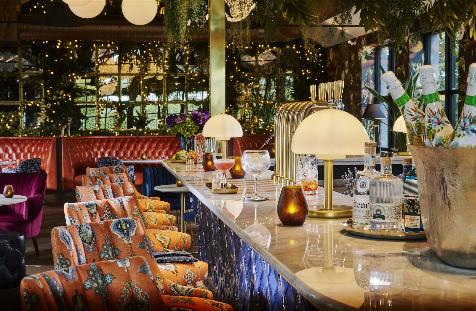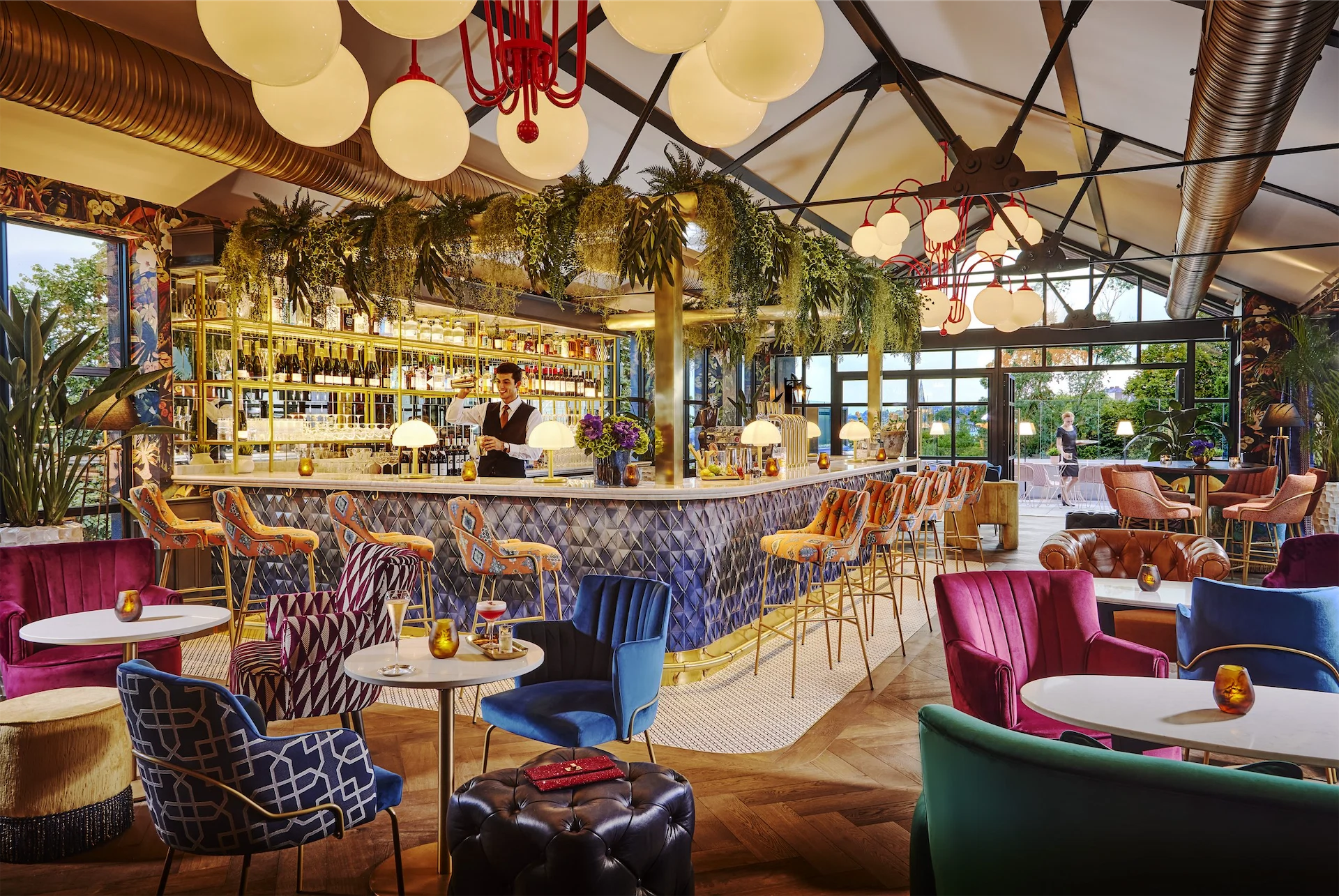 Its isolation gives the space an elevated, exclusive feel and the inside’s gorgeous interior confirms this even more so. The botanical inspired bar has a vibrant, Art Deco design — a mix of bright colours, plush furniture and fresh greenery fill the space.