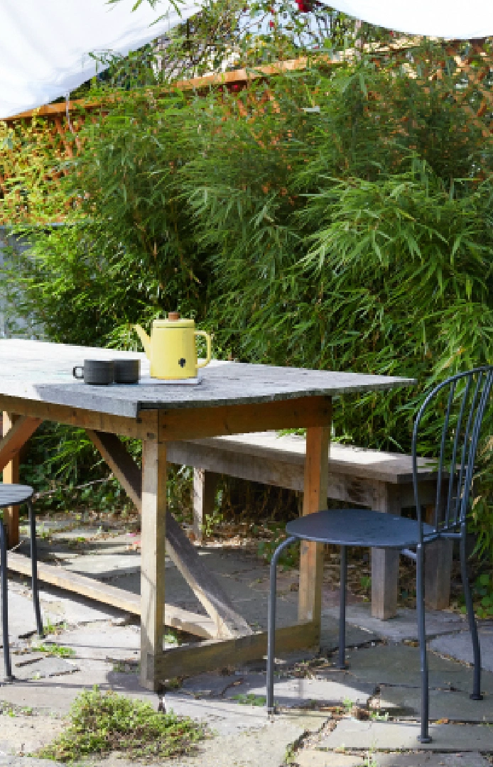 It was built without a single nail or screw and the bath slots neatly into a space under the stone front steps. The window too was carefully considered, as light is precious in these basement rooms, and so it is shared with the bedroom by an ingenious shutter that lets light into both rooms.