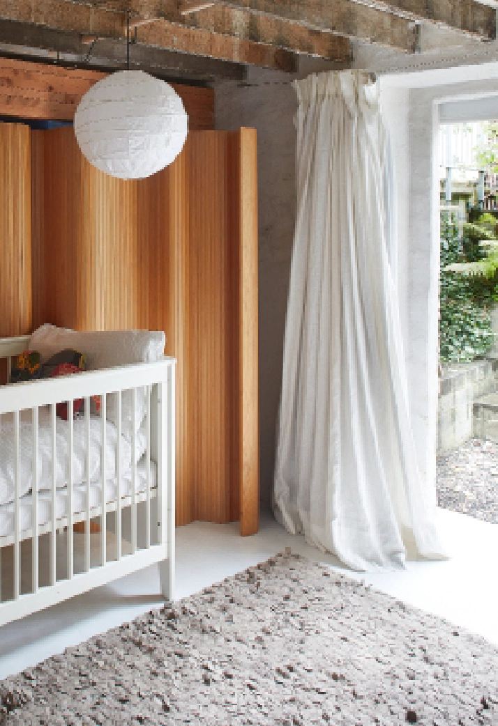 “In order to bring in plenty of daylight we decided to excavate and create courtyards, which could be filled with greenery and also function as accessible outside rooms,” says Douglas. The nursery opens onto the rear courtyard with steps leading to the garden, while the master bedroom and bathroom are to the front, bright but secluded by being down a half-storey from street level.