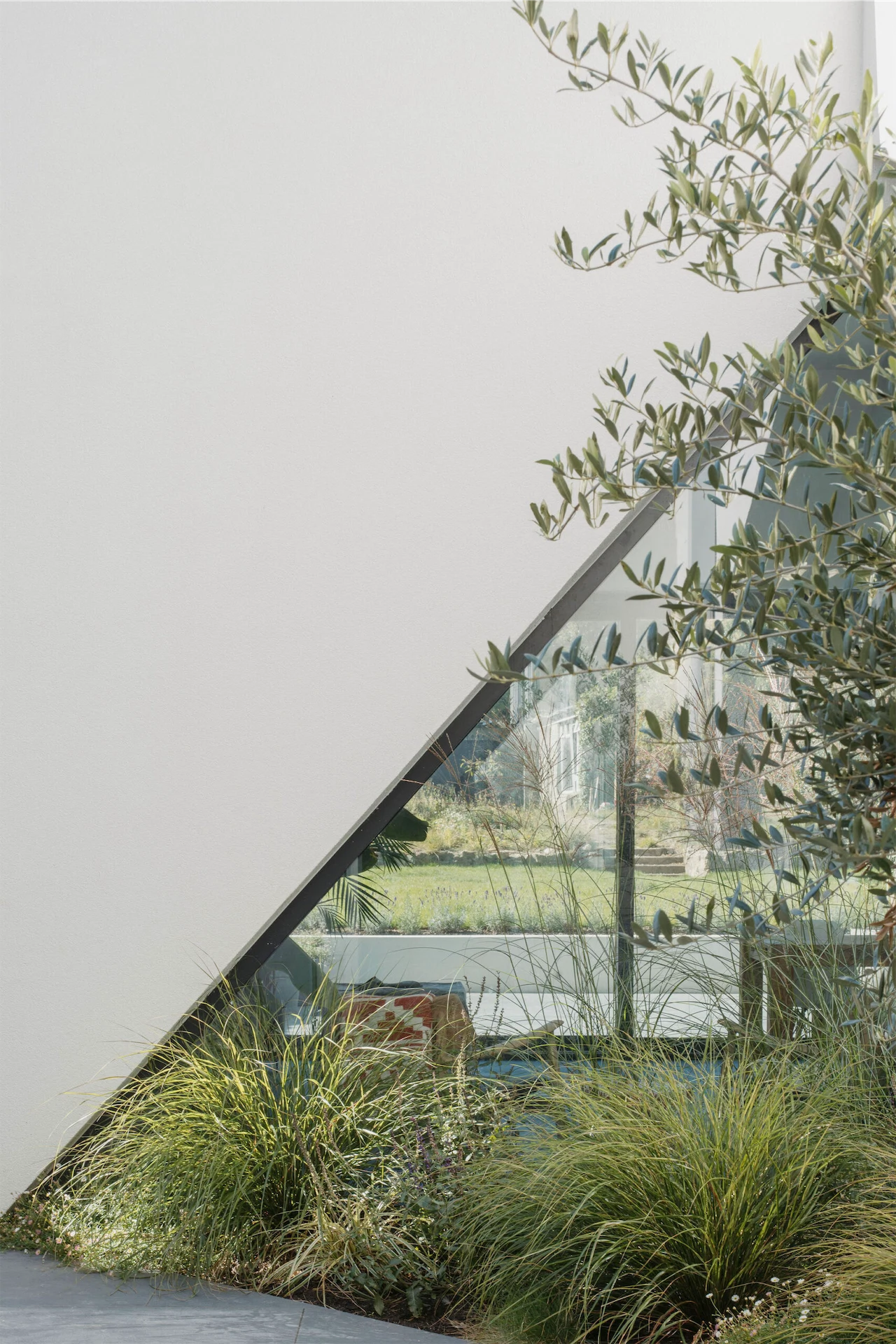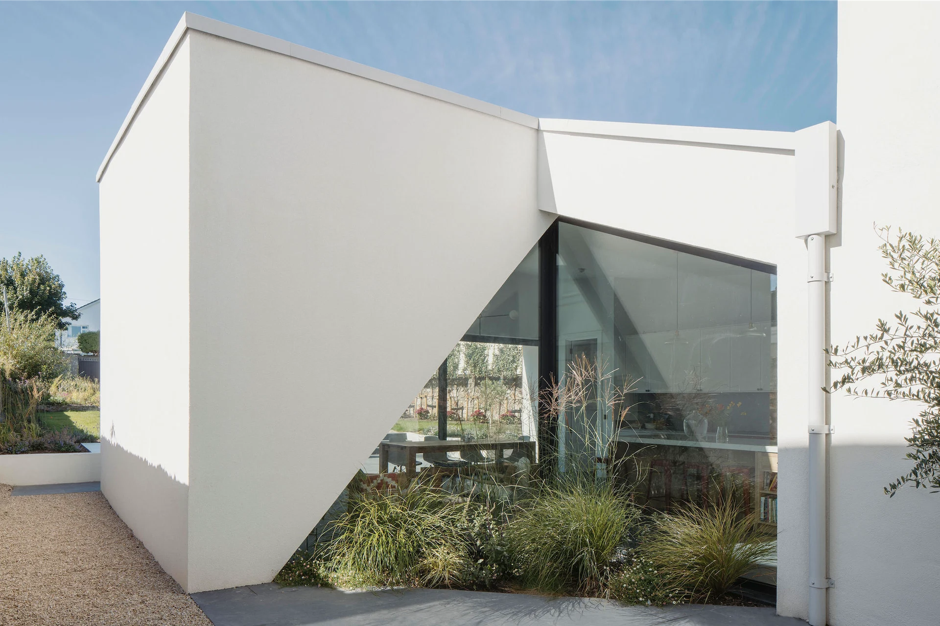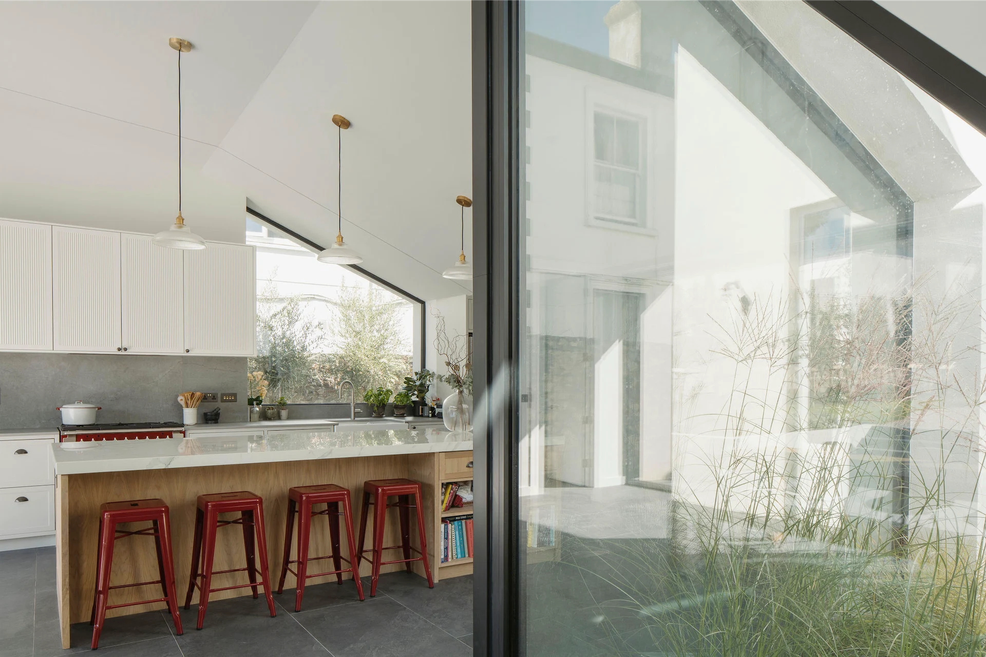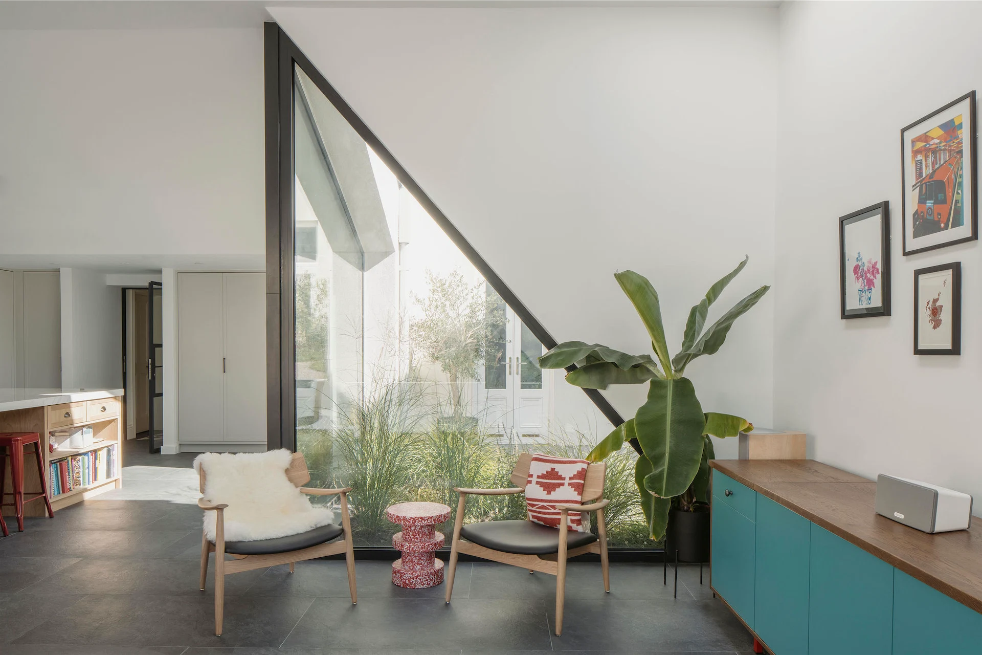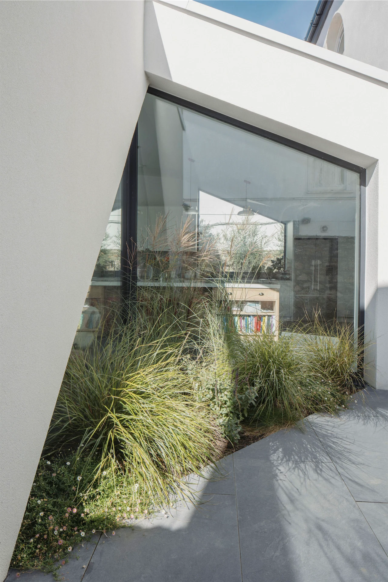 “The single storey extension has high angled ceilings, to match the scale of the original rooms, which spring from a pinch point at the junction to the existing house and open out towards the garden, with angled glazing that addresses two courtyards formed between the new and old building. The courtyard is positioned to pull light into the living space but more importantly it allows the original house to breathe after years of being stifled.”