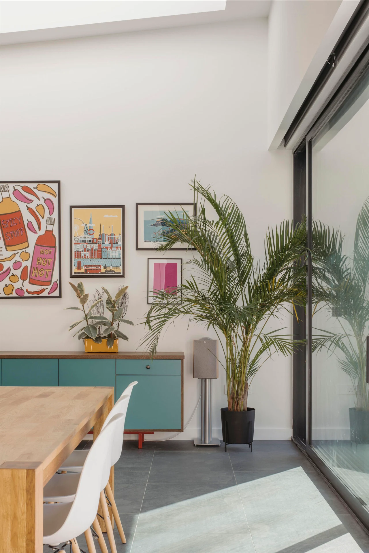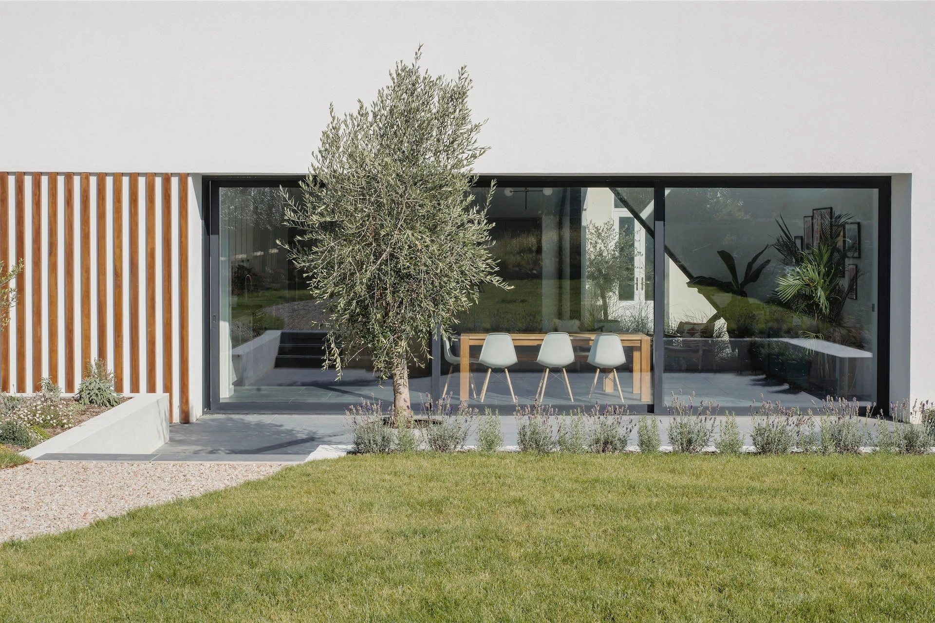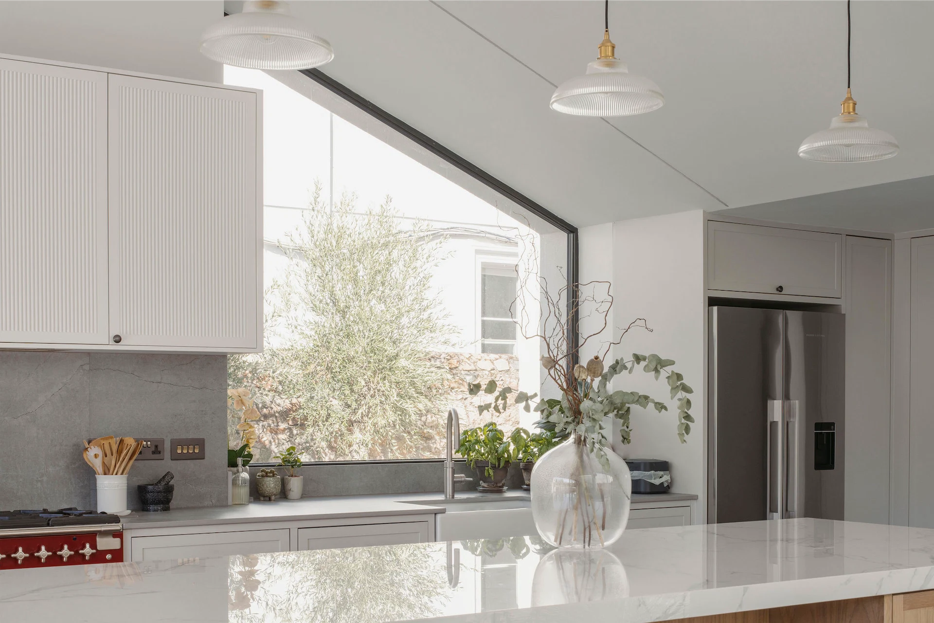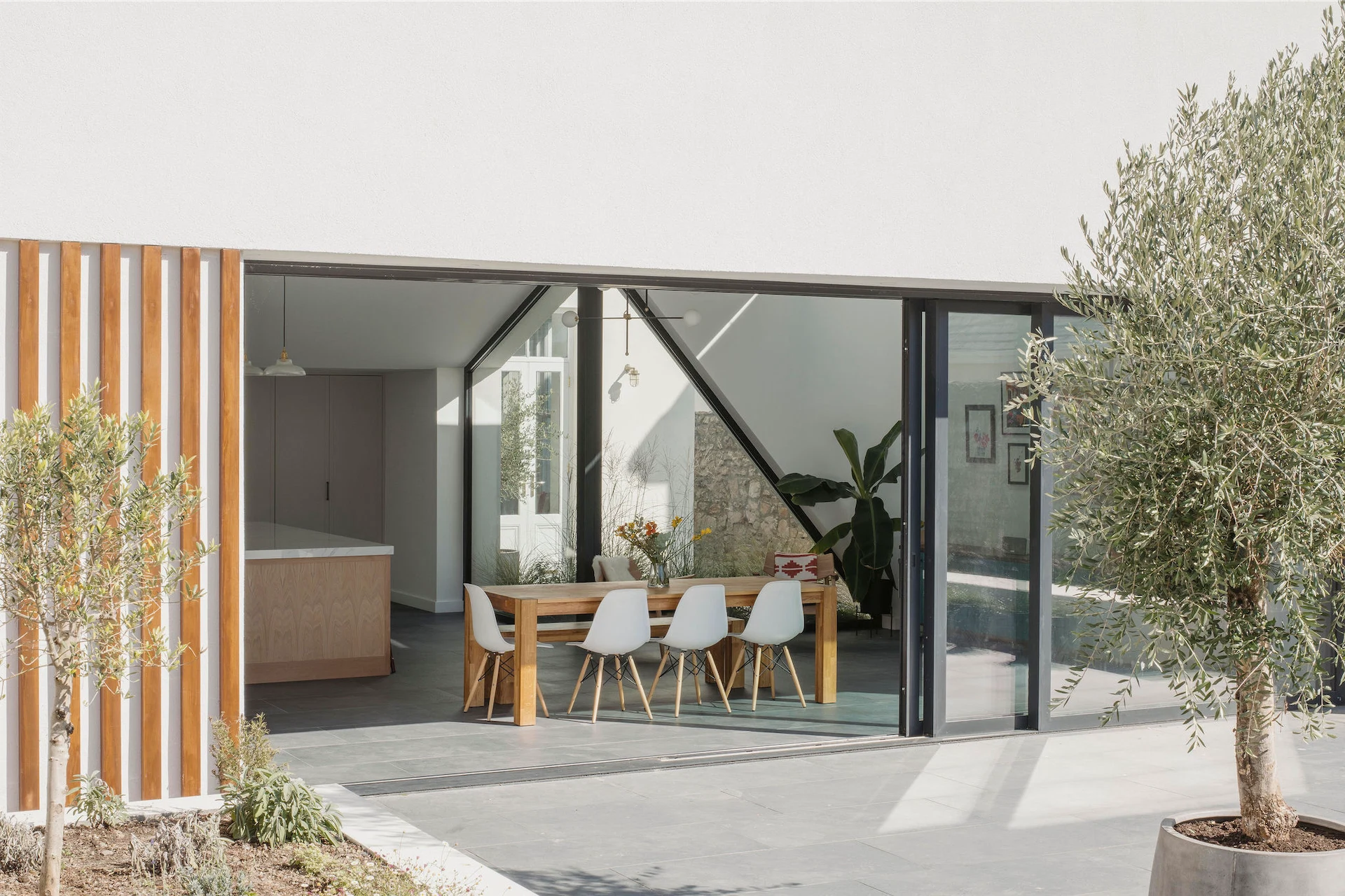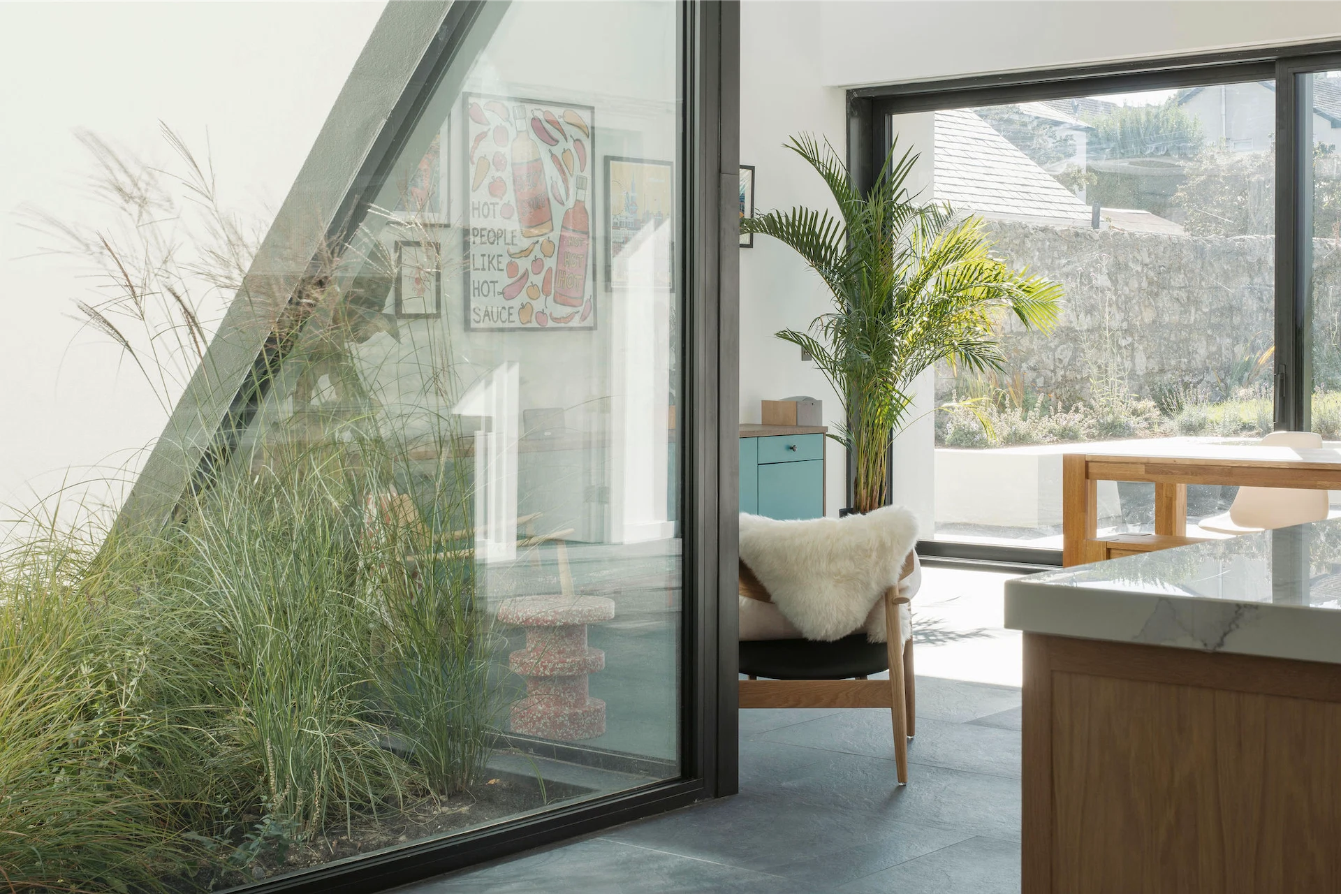 “The single storey extension has high angled ceilings, to match the scale of the original rooms, which spring from a pinch point at the junction to the existing house and open out towards the garden, with angled glazing that addresses two courtyards formed between the new and old building. The courtyard is positioned to pull light into the living space but more importantly it allows the original house to breathe after years of being stifled.”