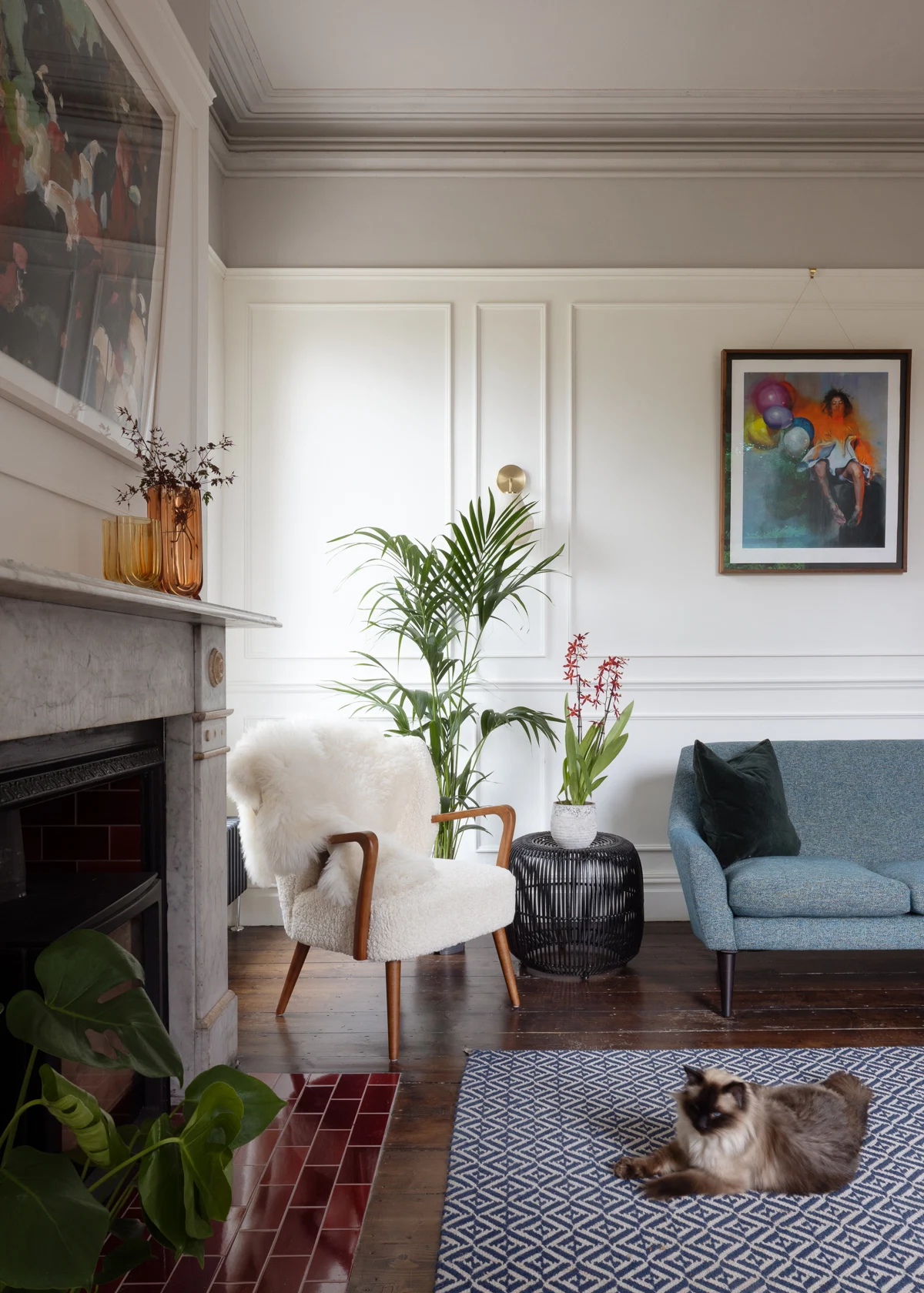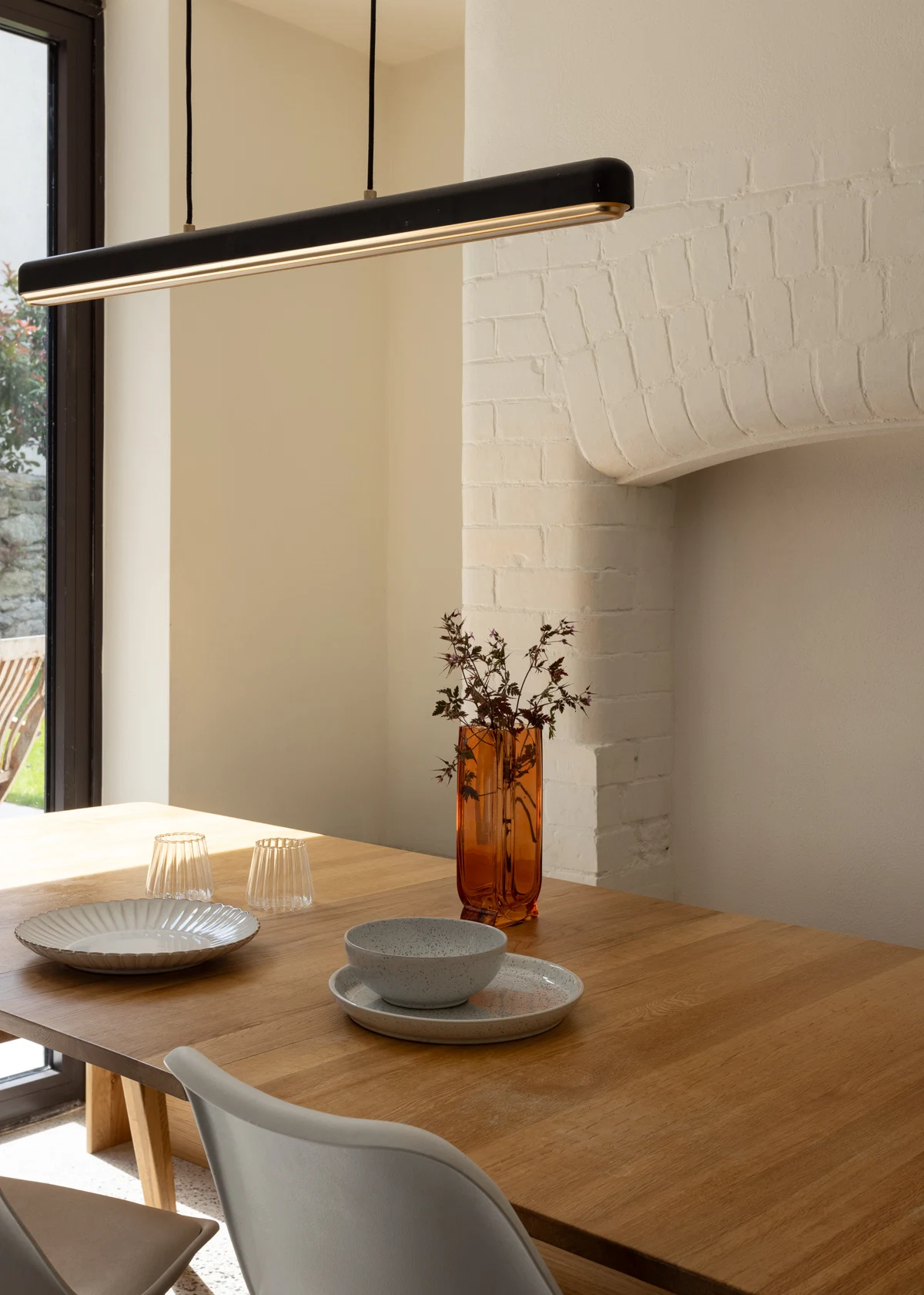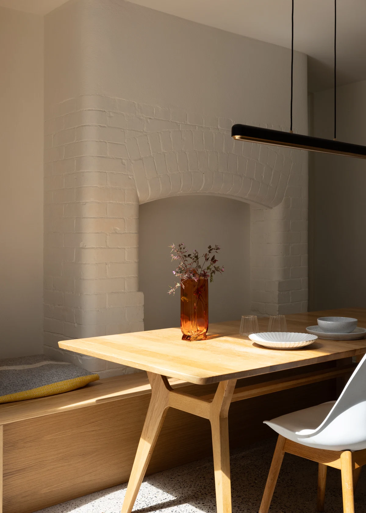 To complement this, the main living, kitchen and dining areas were painted in a warm white, with a grey ceiling to complement the proportions of the rooms. In the dining area, a brick fire breast that was exposed during the works was also painted white.