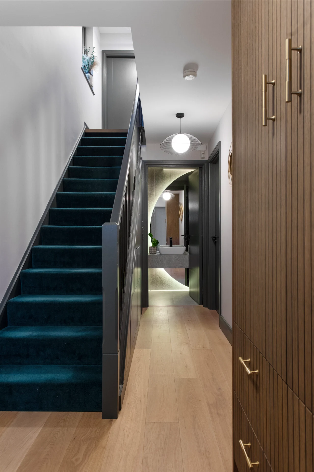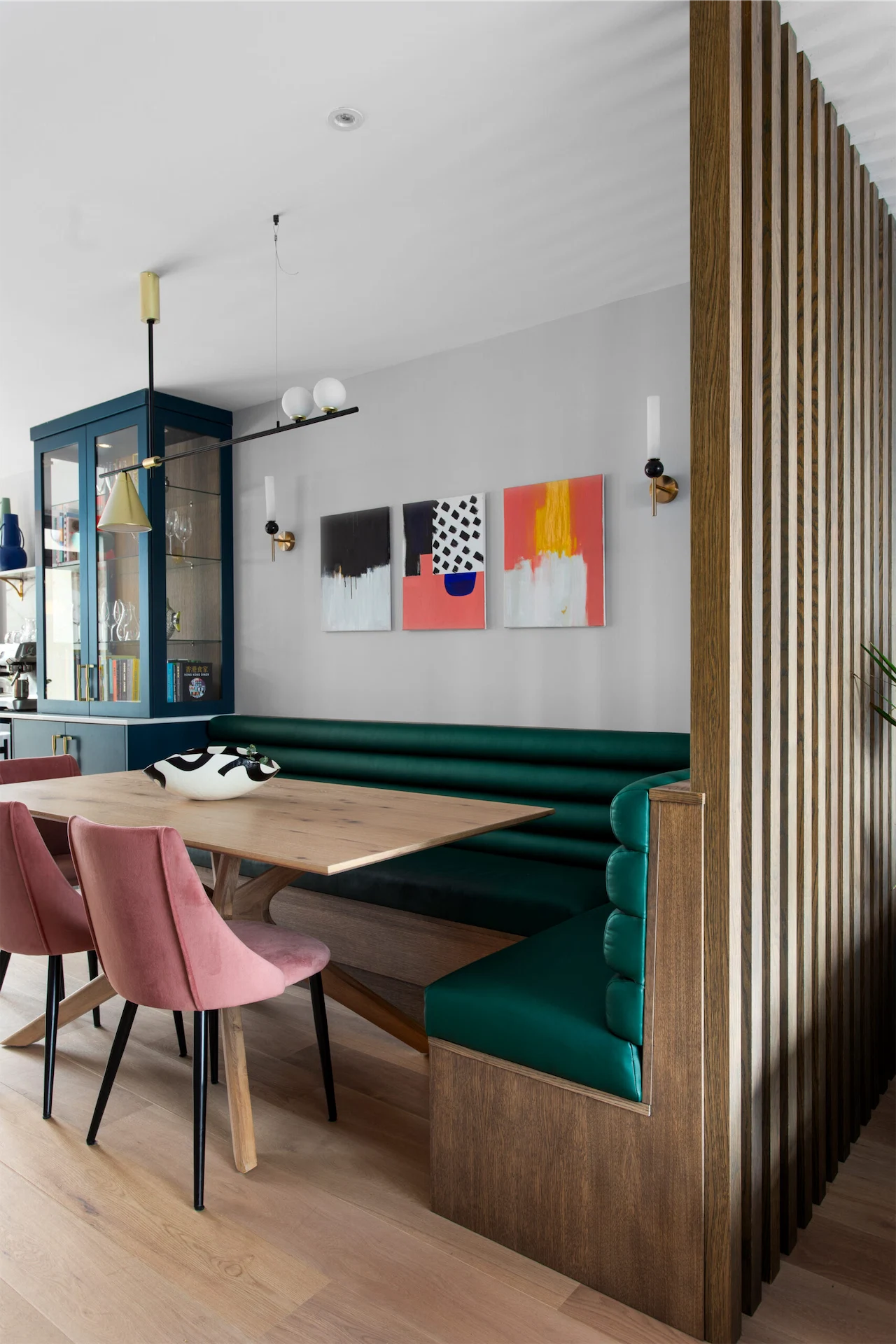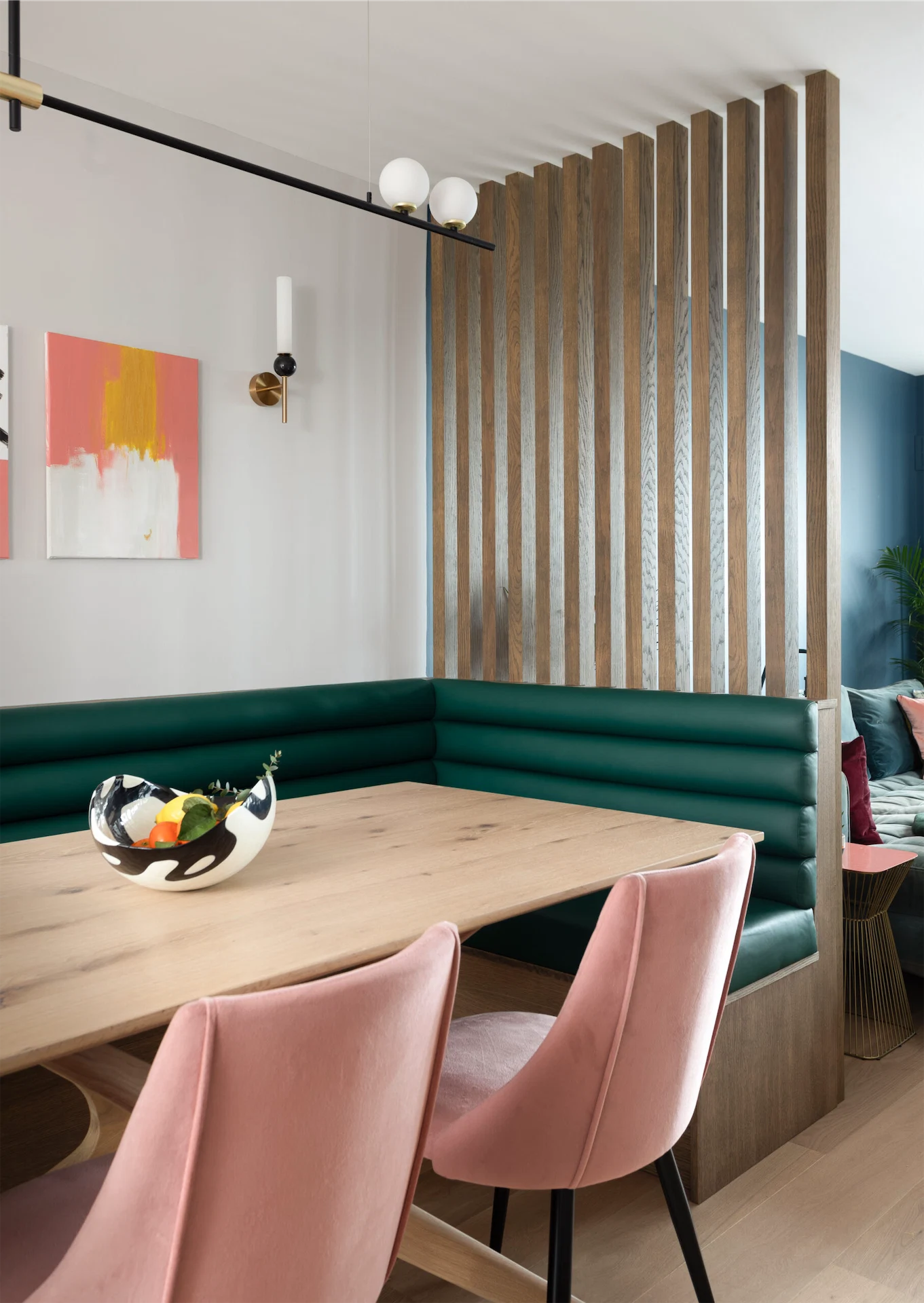 “The ground floor living area is a large open plan area, but we wanted to create zones within the space,” Joanne explains. “This was created with a central dining space and feature slats which nicely divides the space giving the living room privacy from the kitchen and dining area. Materials were very important in the space, so we introduced a mix of timber, stone and brass to contrast nicely with the bolder colours.”