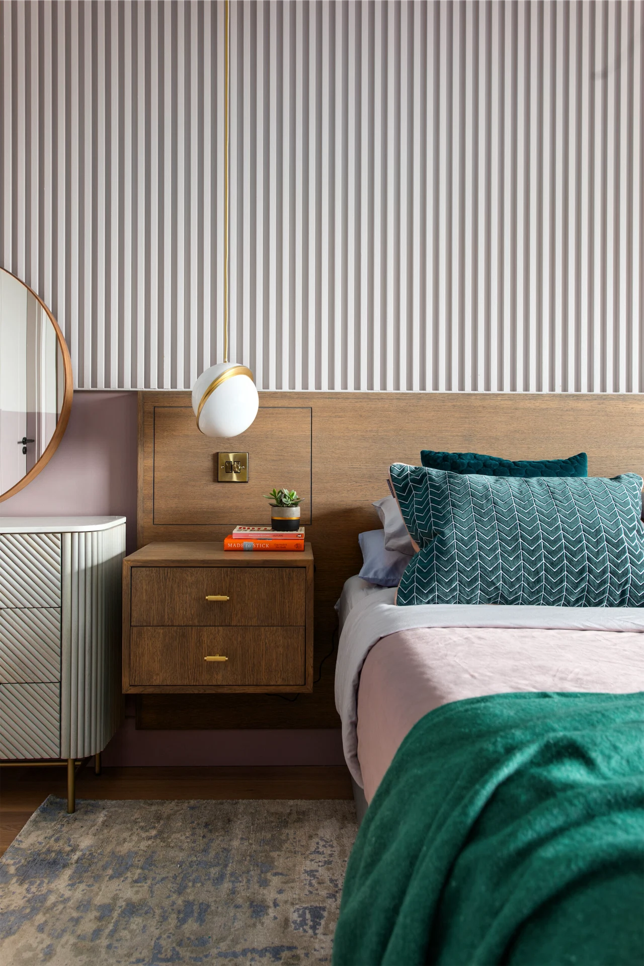 The same luxurious mood was carried through to the main bedroom and ensuite. “Our clients wanted it to feel like a five star hotel. We kept the colours very calm and soothing in this space but really brought the drama with these stunning tiles in the ensuite.” The tiles are from Tile Spex, and the sanitary ware is from Sonas.