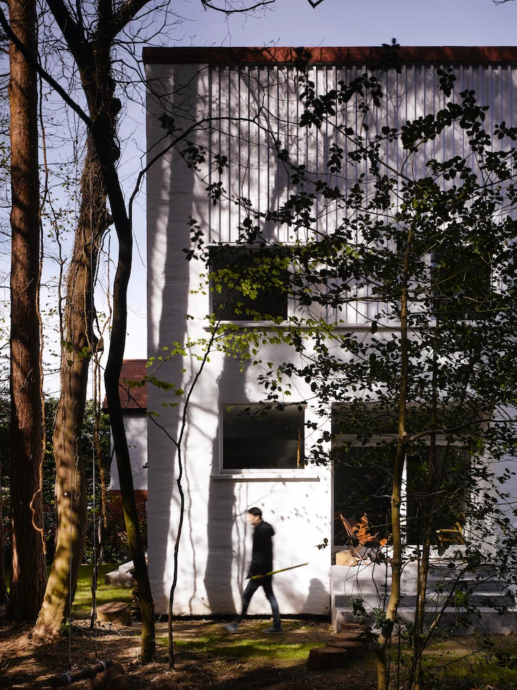 His resulting family home is certainly unique but nestled within an area of protected trees at the foot of his in-laws’ back garden, it didn’t initially seem like the ideal site. However, the magnificent collection of Scot’s pines were part of the draw, and once the site area of shrubbery and brambles was cleared, the vision became clear. “I think we were all shocked at how much space there actually was.”