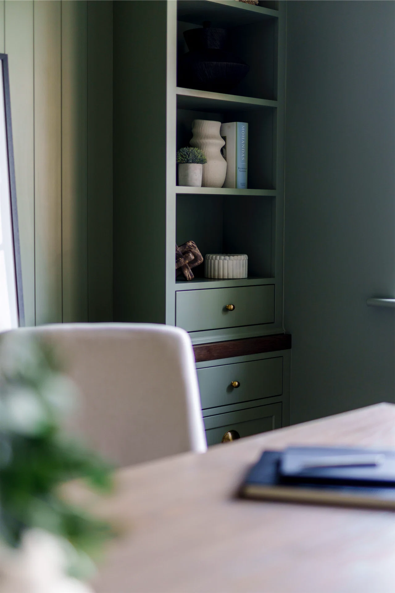 In this home office project in Castleknock, above, the interior design focus was to create a tranquil workspace. The classic artisan green tone on the walls and woodwork, Gris Verte by Colourtrend, is sophisticated, calming and marries with the view from the window of the gardens beyond.