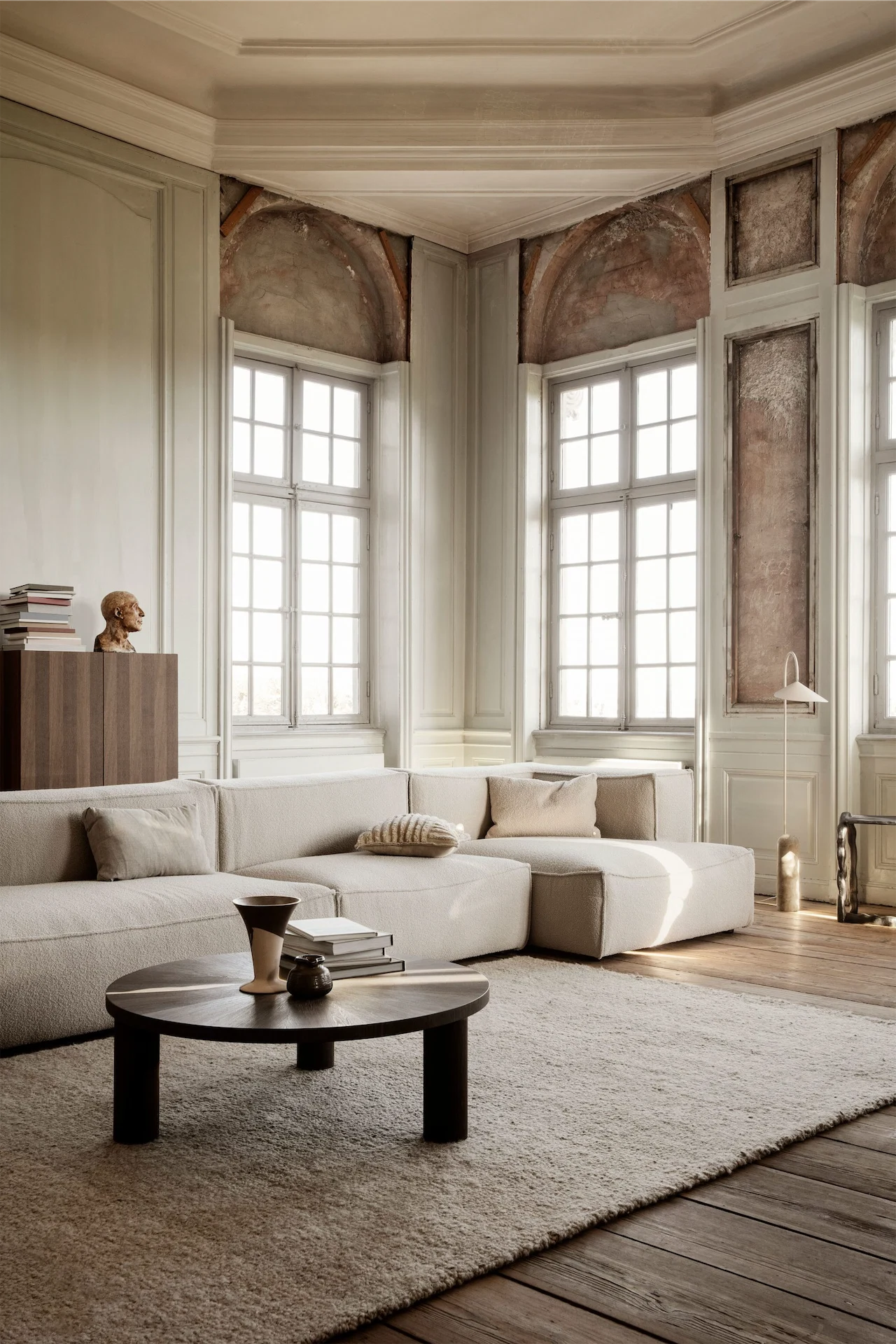 In my work I often place large rugs down over brand new flooring, with clients wondering why we’re hiding the expensive new floor… we’re protecting it! Likewise, I place large rugs down over old floors, like those golden oak floors we all put down 10 years ago. Rugs add style, and hide a lot.