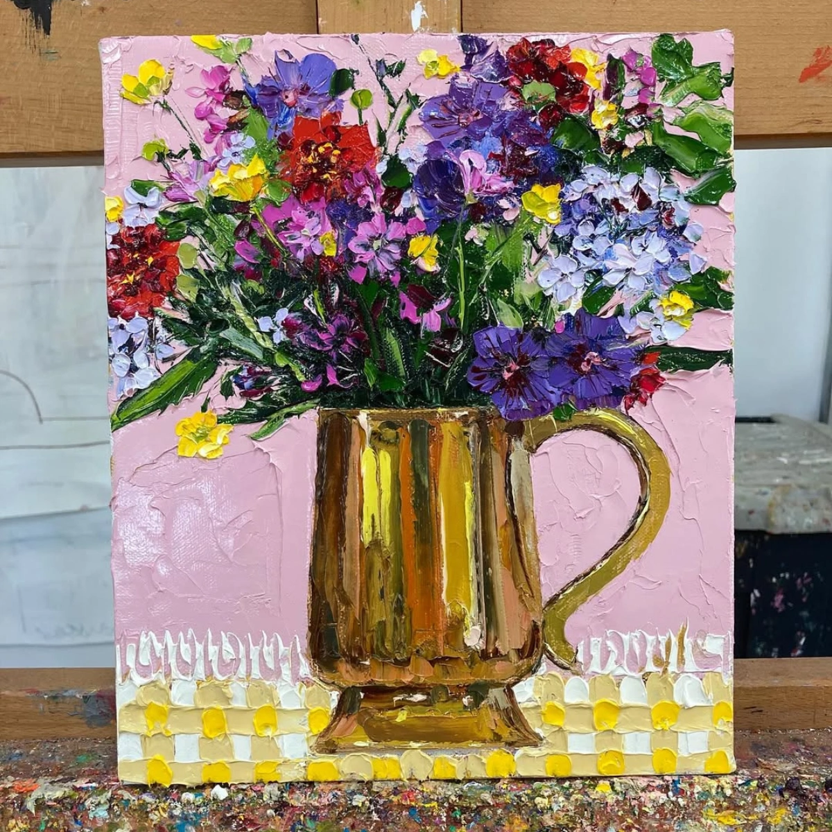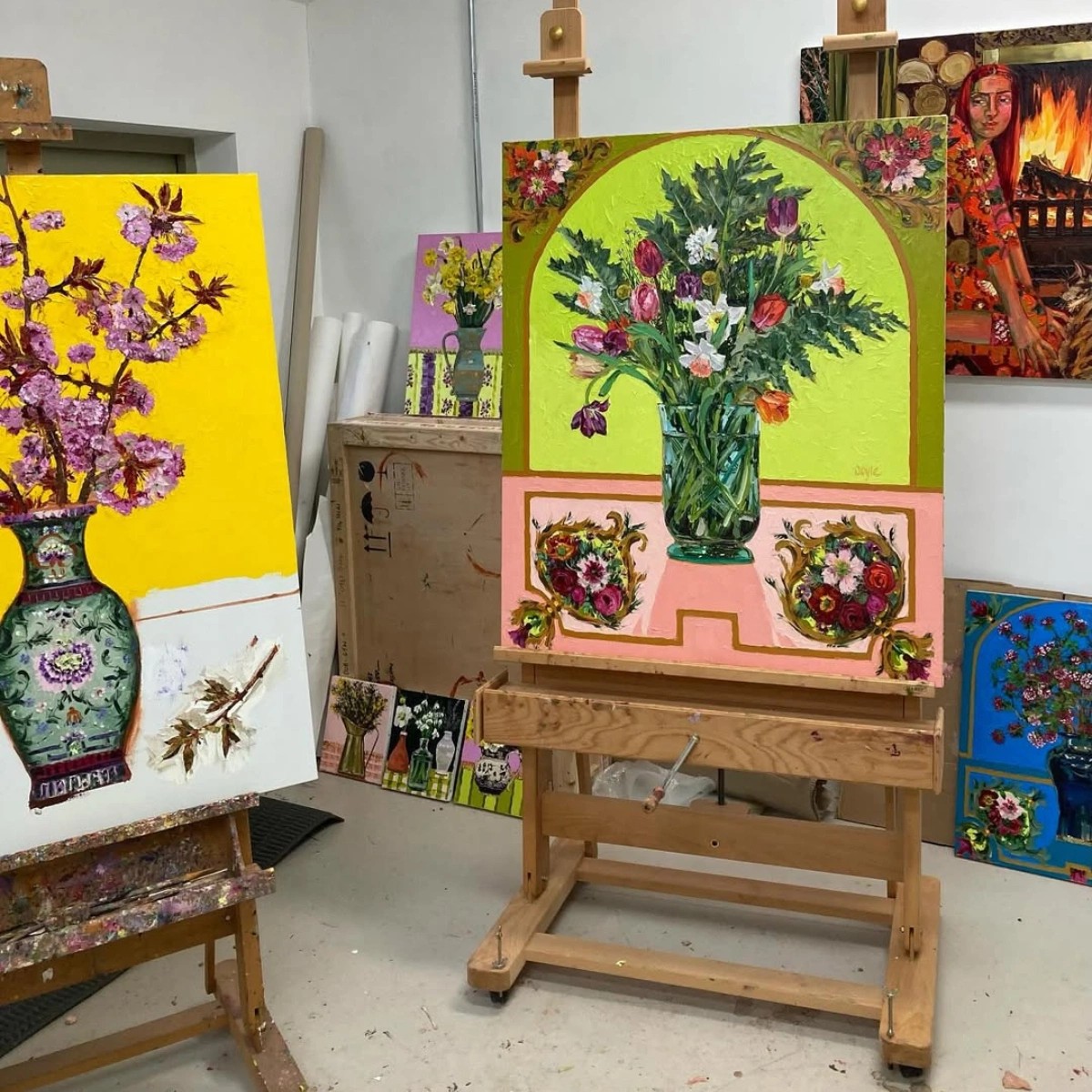 Well I love to be inspired by the flowers in my garden, and I have a designated plot just above my studio where I will grow flowers for cutting and bringing into my studio to paint. So there is always something to work from, whether it’s daffodils in early spring or the flamboyant dahlias that go on flowering until the first frosts hit in late autumn. I have painted two large floral paintings that will be on show now at The Doorway Gallery, Spring Celebration, which is 120×100 cm oil on canvas and Summer Celebration, which is even larger at 152×122 cm of a massive vase of summer blooms against a deep ultramarine blue background. The drama of flower painting!