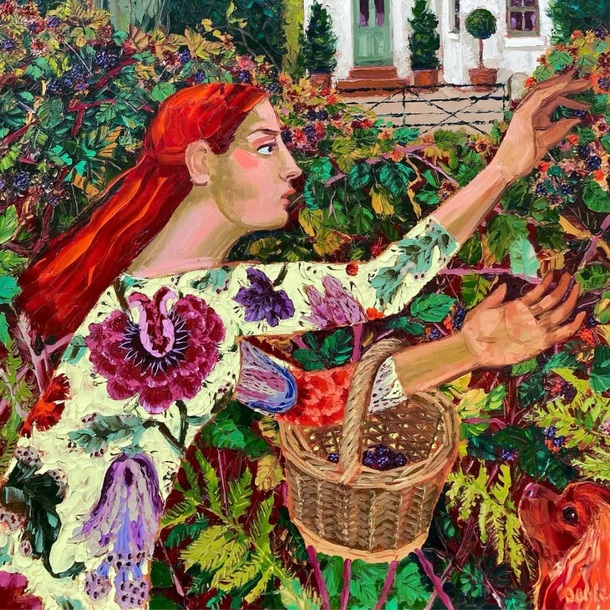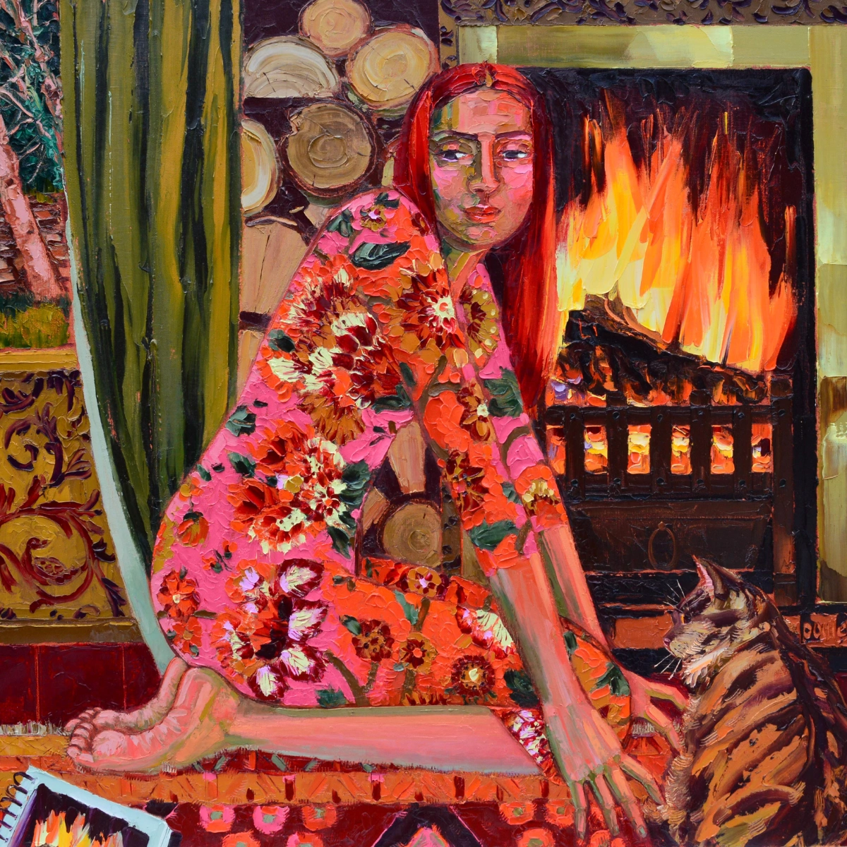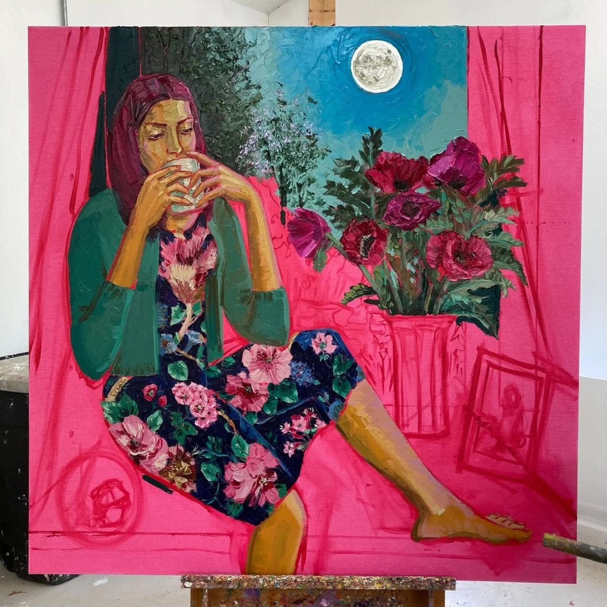 This is a very pertinent question as my current body of work is called Woven and this describes my philosophy on how I have developed my subject matter. When devising a painting, I let ideas fuse in from all areas of my life and filter through with no preconceptions until they collate together in my ‘painting brain’, which is the part of me that knows what will translate into paint and colour and what ideas will ‘settle in’ as a narrative. So it feels like weaving to me. Strands of ideas, feelings, atmospheres, images, past masterworks, textiles, ceramics, my garden flowers, characters in books, films, my daughters, family and pets, these are endless sources of inspirations that make up the tapestry of my paintings. Just simply because I am living and being.