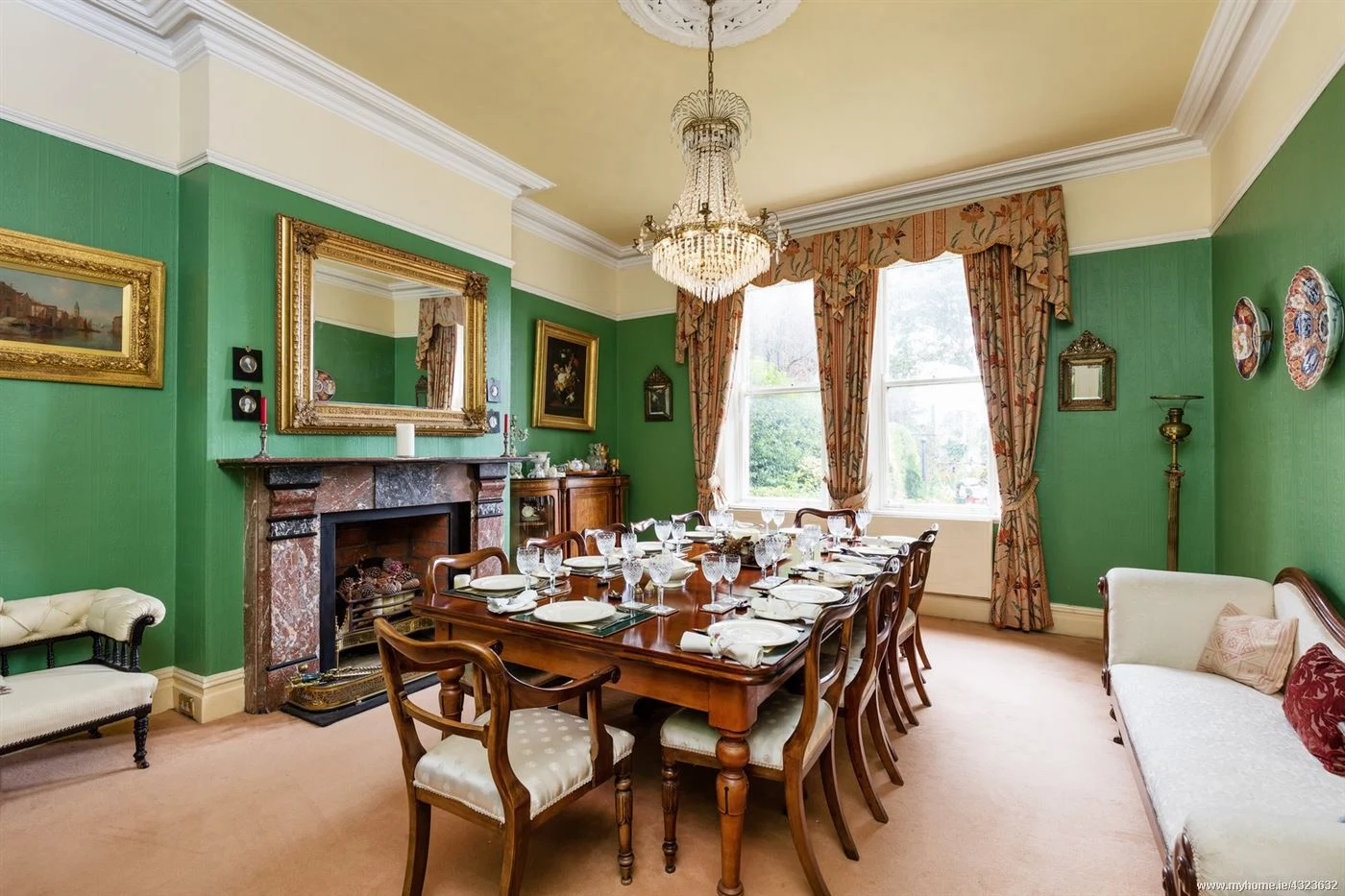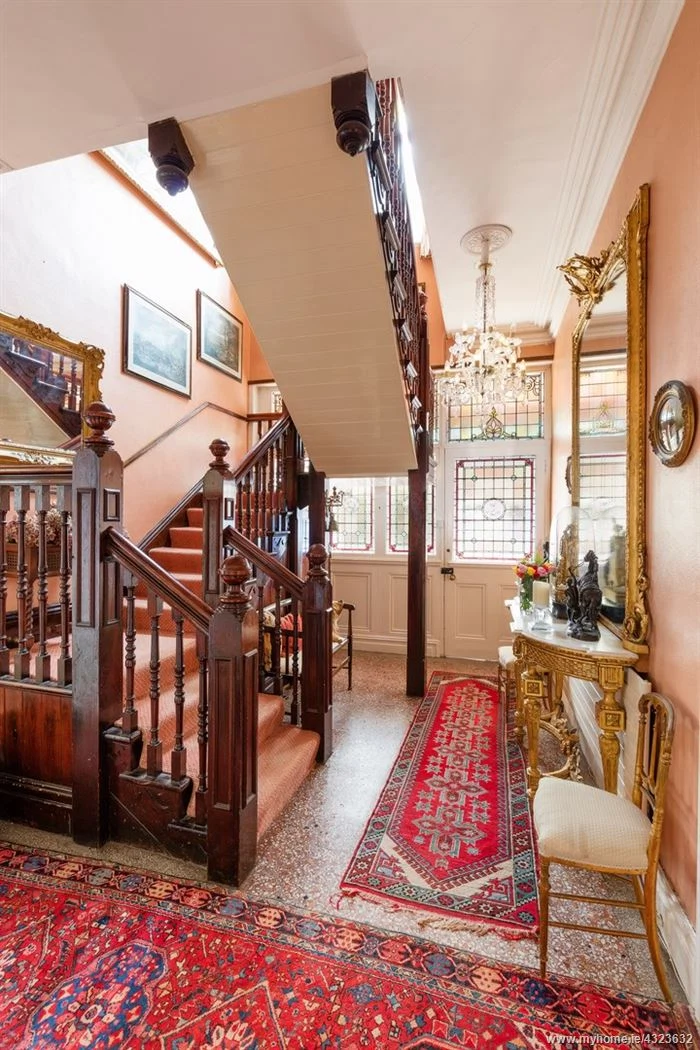 Through the front hall, with its original timber joinery and stained glass front porch, are three well-proportioned reception rooms. A grand dining room and drawing room sit towards the front of the house, both with a grand marble fireplace and its centre.