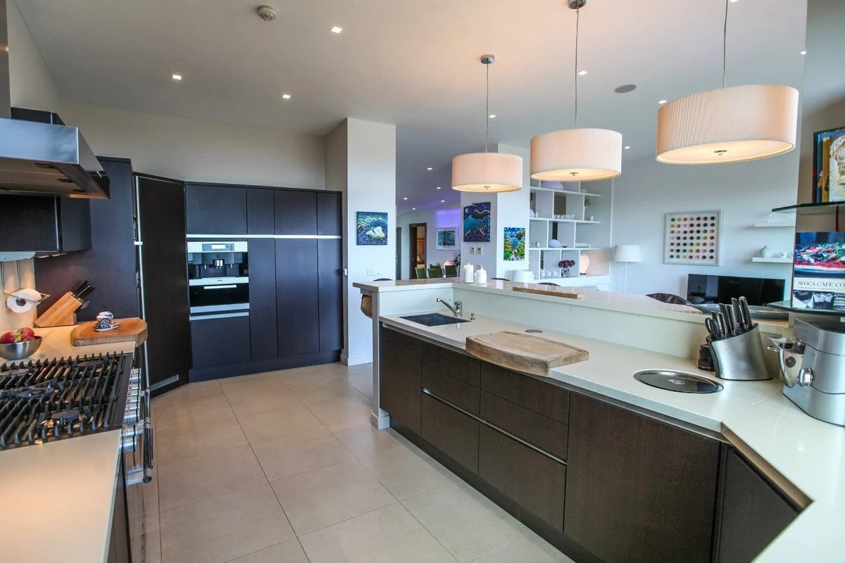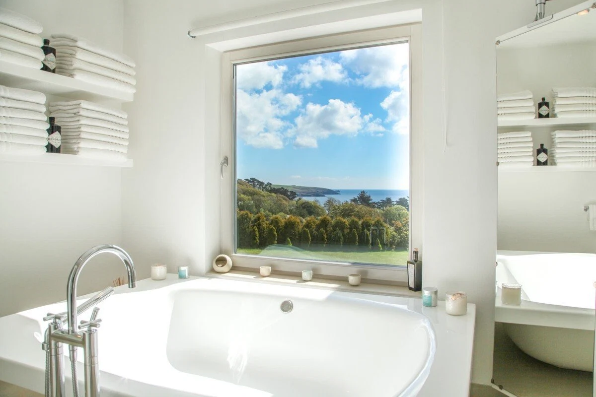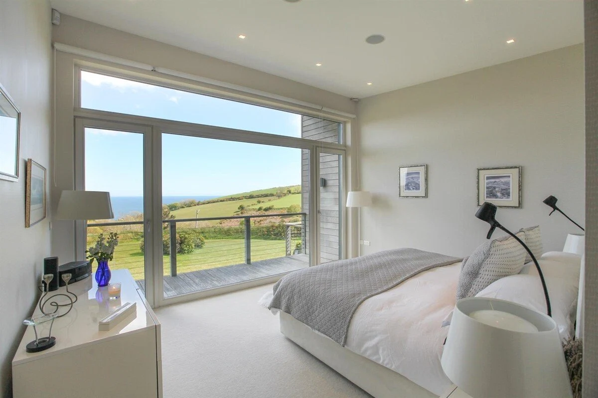 A dry room, guest bedroom with en suite and utility are located near the front door, ensuring the largest bedrooms all have sea views. The master suite has its own dressing room and an en suite almost as large as the bedroom. Inside is a shower/steam room and a double bath overlooking the water. Two more seafront bedrooms can be found here, as well as a family bathroom and study. There’s plenty of storage to be found within the almost 300-square-metre house too.