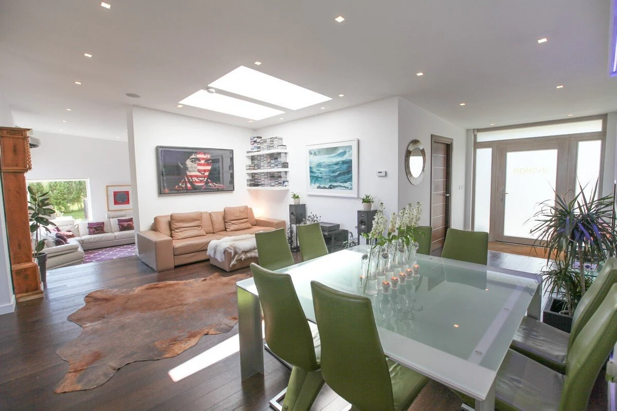 Constructed in 2019 by its current owners and their architect and currently on the market for €2.35 million, the house is centred around the view, the roof tilted slightly to reach you at every opening. Accessed through electric gates, you can’t see the house from the road thanks to a grassy knoll added for privacy. The front door leads into a large, open-plan hallway and dining room with an aspect that runs straight down to the water through the glass sliding doors at the other end of the house.