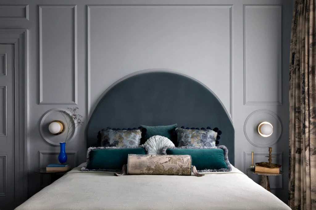 This Galway home designed by Róisín Lafferty nods to the building’s history while adding a sense of structure to the room with carefully designed panelling. It’s painted in a soft blue to add a sense of calm, while the pared-back bed nods to a more contemporary style.