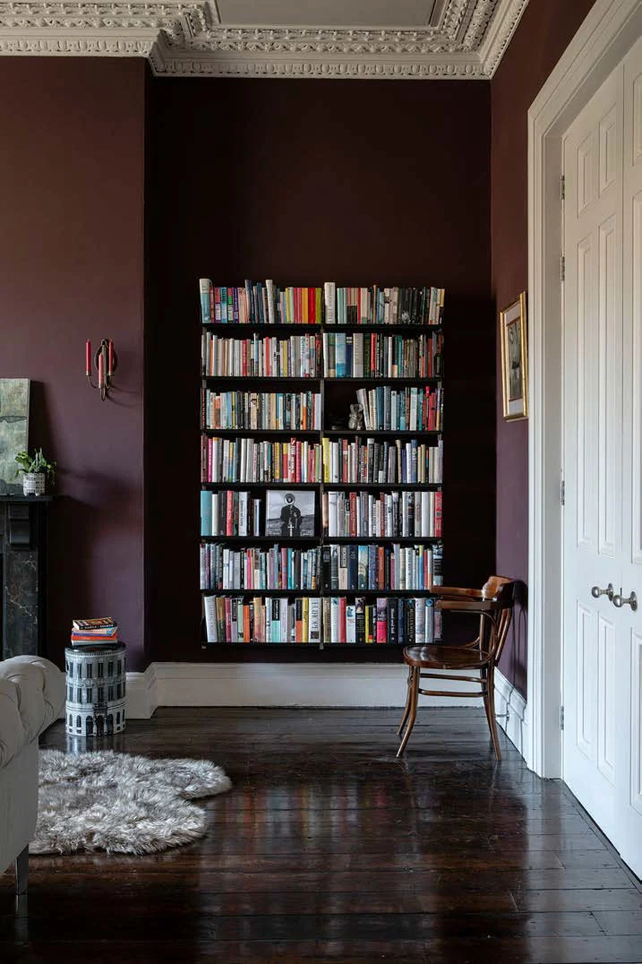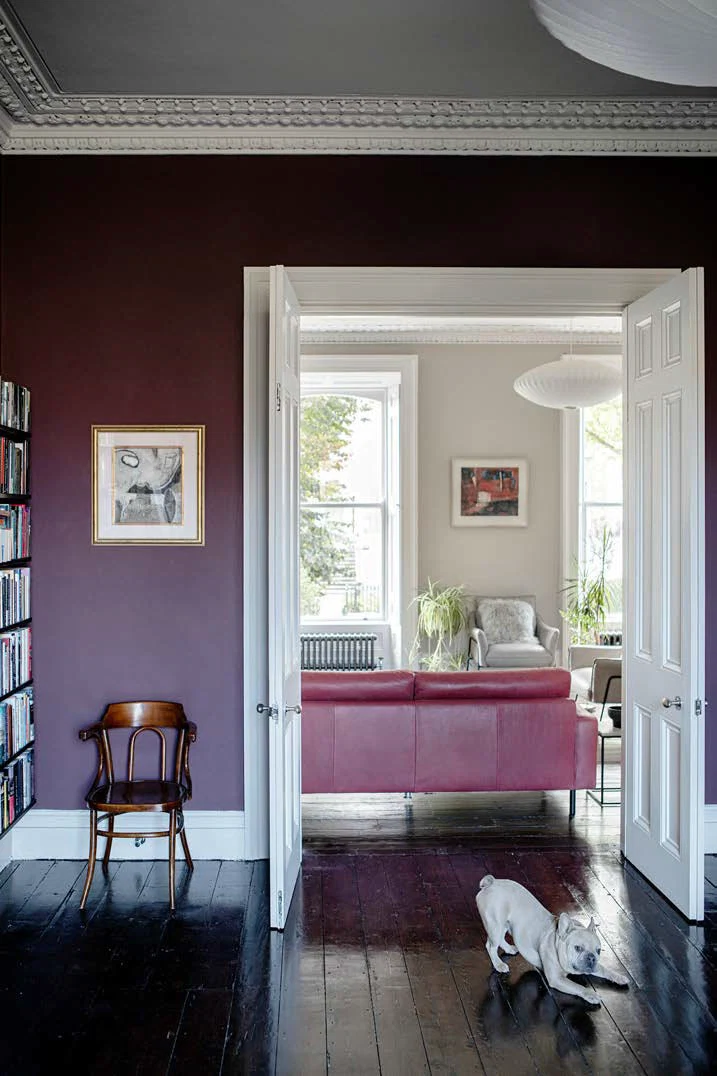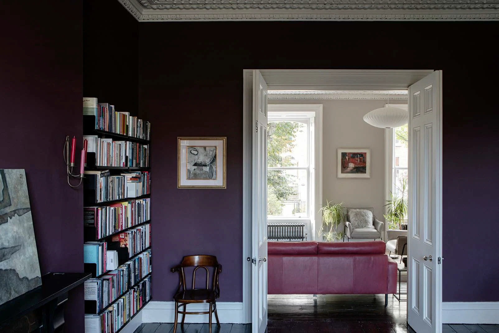 Double doors were added between the two main rooms, one of which is used as a living room, while the other, painted in a rich purple shade, is used by the owners as a library.