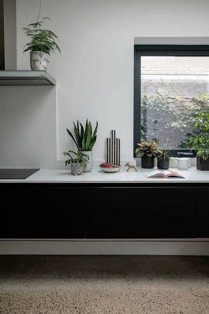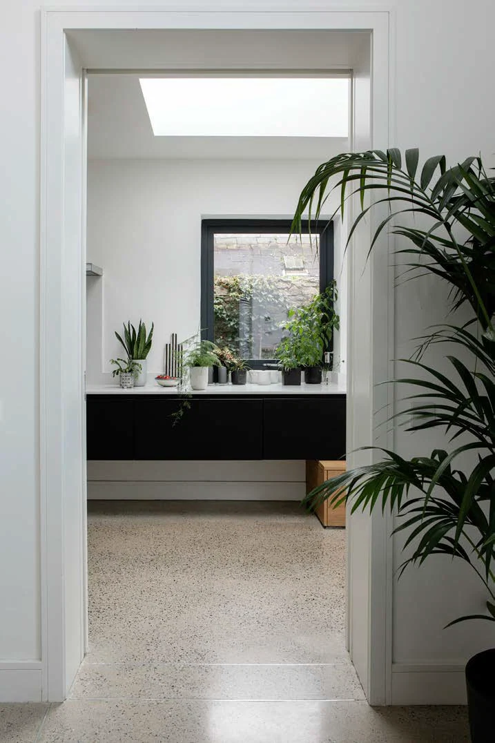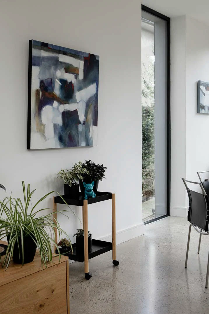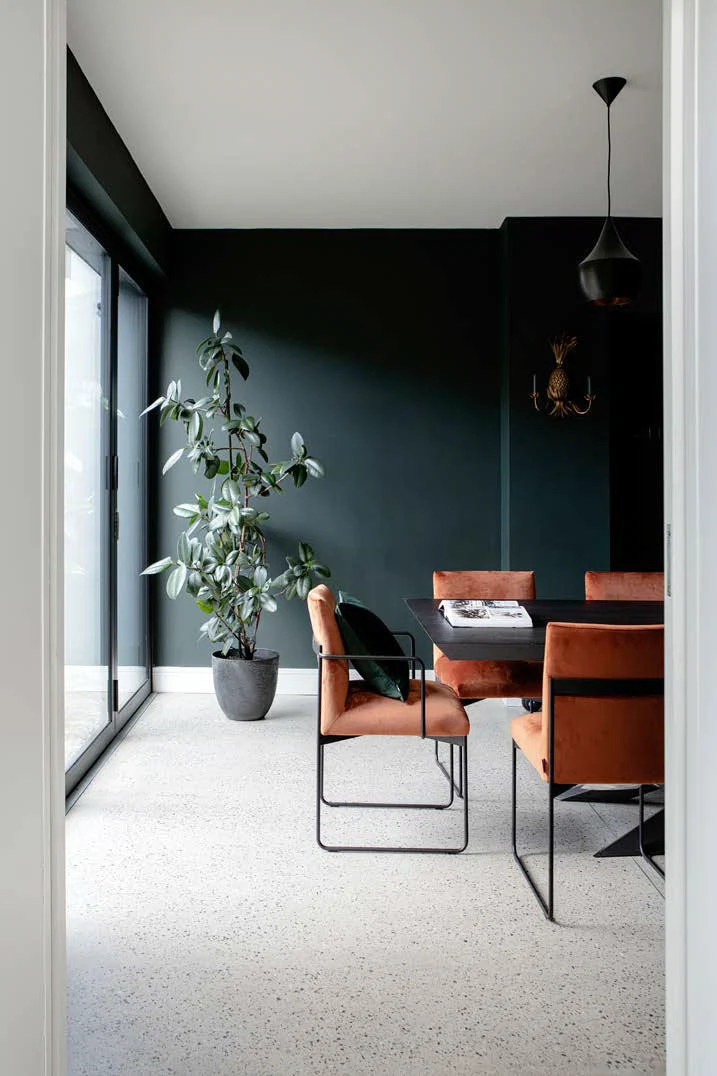 The floating Michael Farrell kitchen continues this modern feel, while the dining room has been painted in a moody shade, adding contrast.
