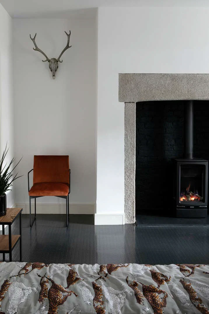 An existing bedroom on the basement level has been restored, revealing a beautiful stone hearth.