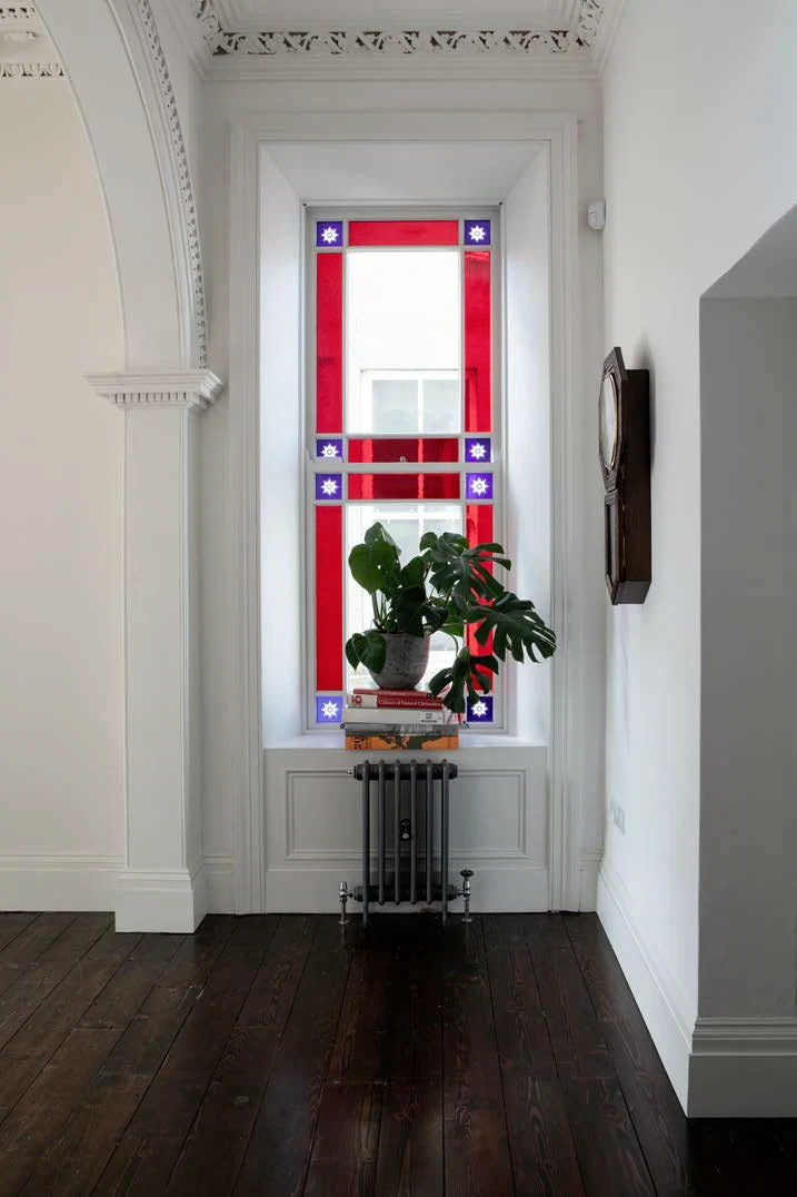 Stained glass windows were added in the hallway, as were glass panels to the side of the front door, helping to brighten this space.