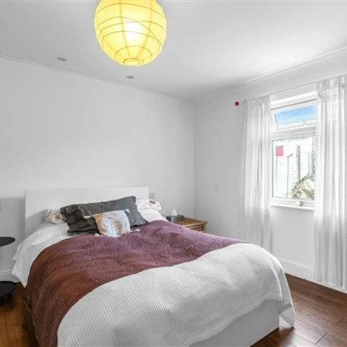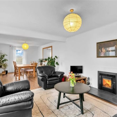 Cosy and modern with warm furnishings, the dining/living room is designed to embrace natural light with its four large windows. Traditional coving and an open fire are amongst the other highlights in this room. The patio doors open out to the courtyard, creating an effortless indoor-outdoor flow. Beautiful wooden flooring also runs throughout the house.